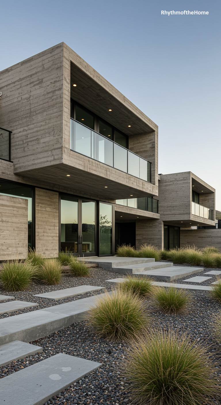 This striking modern home rises from the earth like a geological formation, its powerful form defined by raw, board-formed concrete. The architecture is a bold composition of massive, cantilevered blocks, creating deep, shaded balconies protected by minimalist glass railings. The rugged texture of the concrete walls is softened by expansive glass doors that hint at a light-filled interior. Surrounding the structure, a drought-tolerant landscape of river stones and wispy ornamental grasses complements the home’s elemental and monumental character, creating a seamless fusion of bold design and the natural environment.