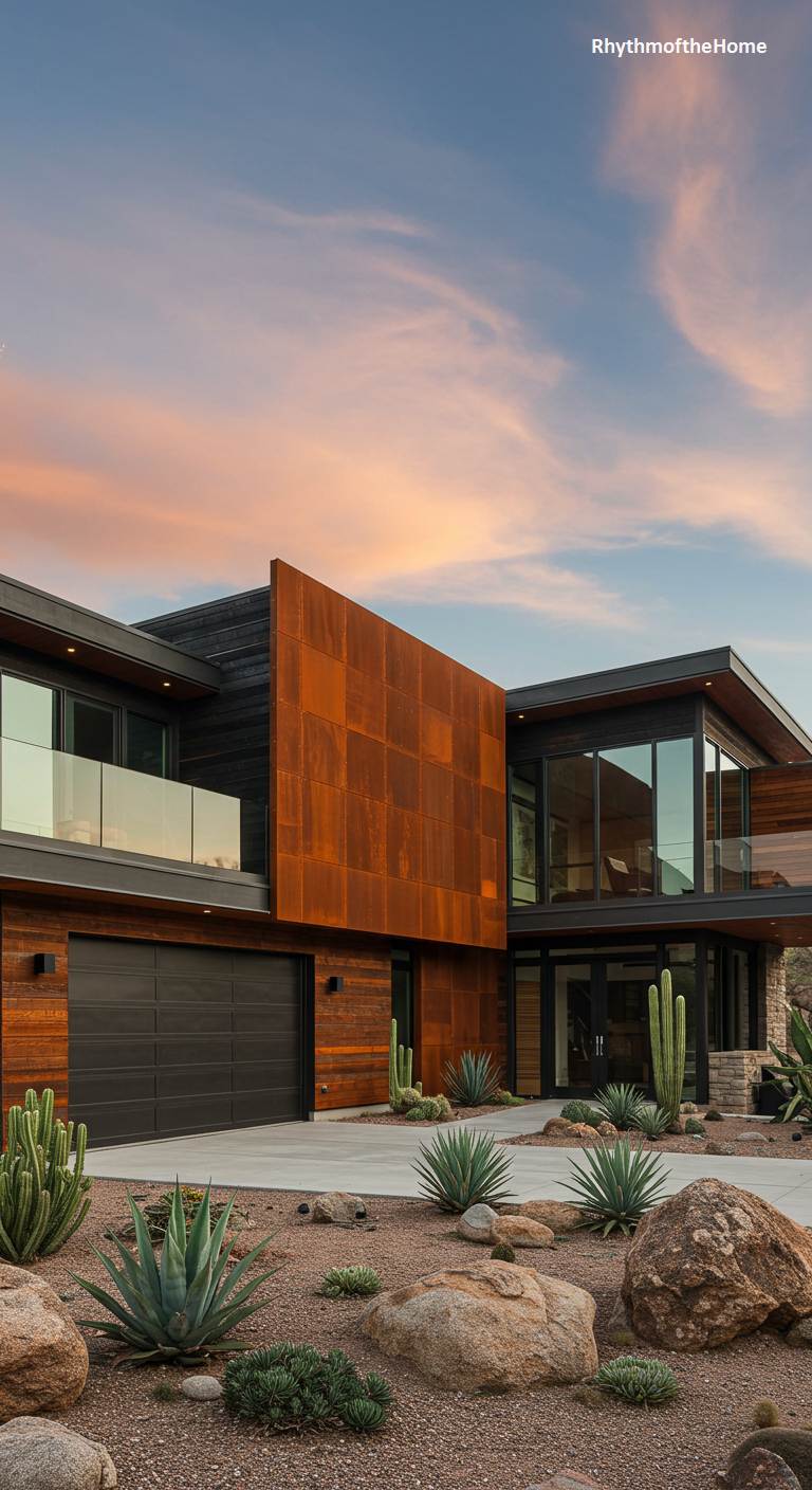 Bathed in the warm glow of a desert sunset, this modern home is a masterful blend of industrial chic and organic warmth. A dramatic facade of weathered Cor-ten steel creates a stunning, textural centerpiece, its rich patina echoing the tones of the surrounding landscape. Expansive glass walls blur the line between the stylish interior and the rugged exterior, which features a carefully curated xeriscape of cacti, agave, and sculptural boulders. The home’s low-slung, angular rooflines and dark wood accents ground the structure in its environment, crafting a residence that is both a bold statement and a respectful tribute to the desert.