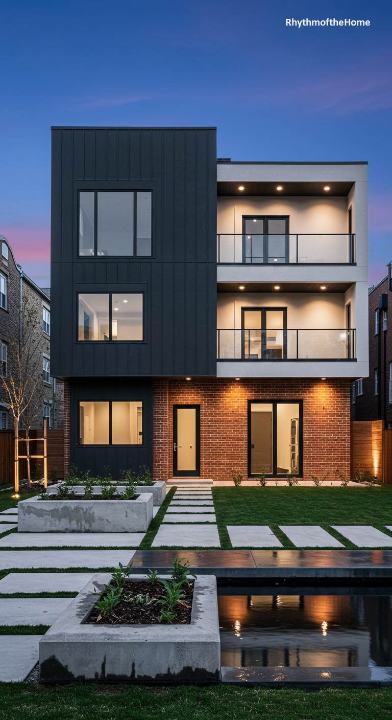This urban modern home makes a sophisticated statement with its dynamic, multi-layered facade. A commanding block of dark, vertical metal siding on the left is artfully balanced by a section of clean white stucco and open-air balconies on the right. The entire structure is anchored by a warm, red brick base, adding a touch of classic texture to the contemporary design. At twilight, the home glows from within, while landscape lighting illuminates concrete planters and a serene reflecting pool. This residence is a brilliant example of architectural variety, thoughtfully composed to create a chic and livable space within a city setting.