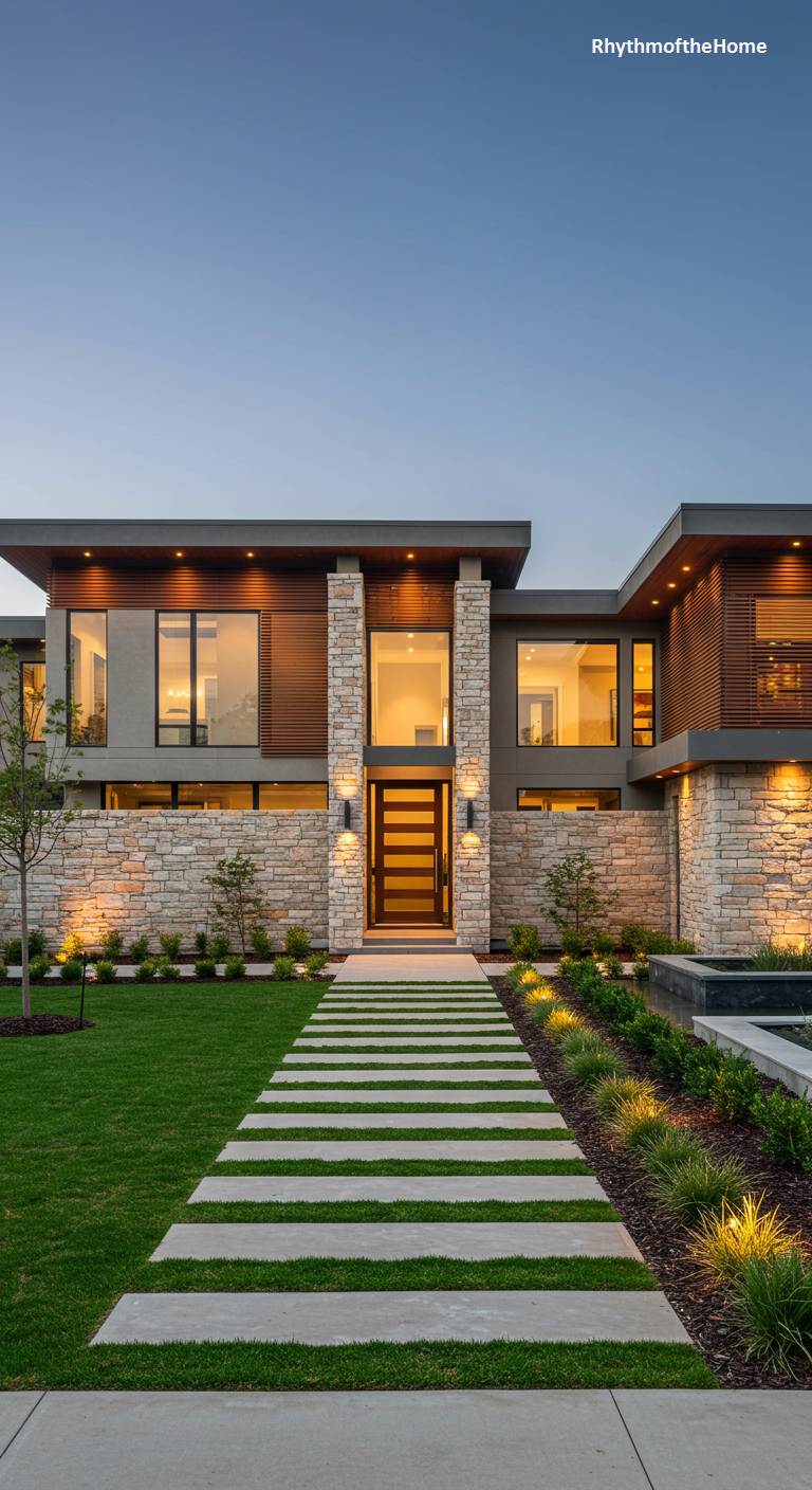 Exuding an air of grounded luxury, this expansive modern home showcases a rich interplay of natural materials. Strong vertical pillars of rough-hewn, light-colored stone anchor the entrance, contrasting beautifully with the smooth grey stucco and warm horizontal wood screens. The home’s signature horizontal lines are emphasized by a broad, overhanging roof and a meticulously laid paver walkway that seems to float over the pristine lawn. As evening descends, a symphony of landscape and architectural lighting creates a warm and inviting ambiance, highlighting the intricate textures and celebrating a design that is both grand and intimately connected to its landscape.