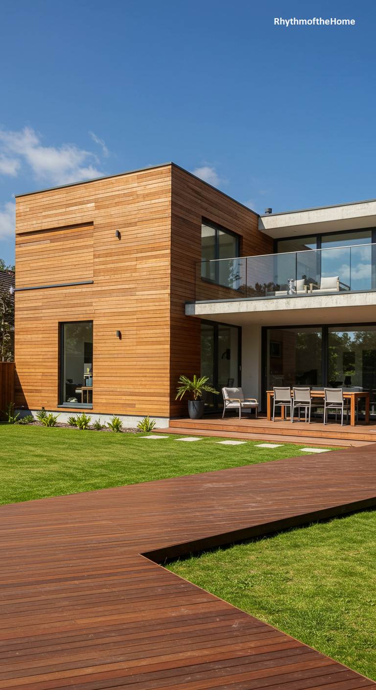 This modern home is a study in warm minimalism, where clean, cubic forms are softened by the rich texture of horizontal wood cladding. Bathed in brilliant sunlight under a vast blue sky, the structure’s sharp lines contrast beautifully with the manicured green lawn. A dark wooden deck carves an elegant path through the grass, leading towards a shaded patio perfect for al fresco dining. Large windows and a glass-railed balcony dissolve the barriers between the sleek interior and the vibrant outdoors, creating an inviting sanctuary that celebrates both sophisticated design and the simple beauty of a perfect day.