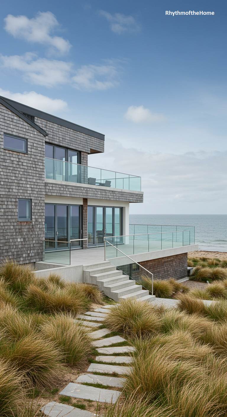 Embracing its dramatic seaside setting, this coastal modern home exhibits a rugged yet refined grace. The facade, clad in weathered grey shingles, echoes the muted tones of the expansive sky and the sandy dunes below. Expansive glass balconies, secured with minimalist railings, offer breathtaking, uninterrupted views of the ocean’s horizon. A set of simple concrete steps descends towards a stone path that meanders through wild beach grass, seamlessly connecting the sharp, contemporary architecture with the untamed beauty of the coastline. This is a tranquil retreat designed for quiet contemplation against the backdrop of the sea.