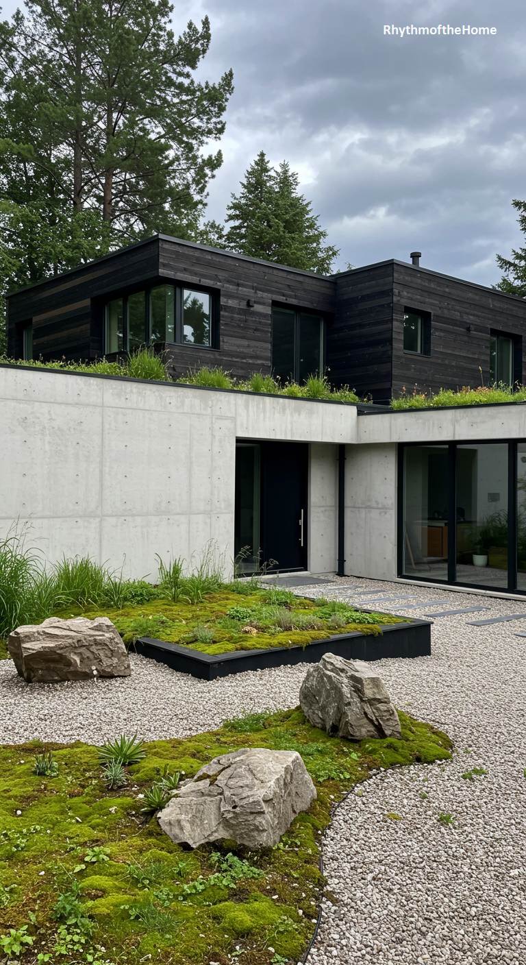 This striking modern home exudes a quiet, contemplative elegance, drawing deep inspiration from Japanese design. Its upper level, wrapped in dramatic black charred wood, appears to float above a solid foundation of textured board-formed concrete. A living green roof softens the structure’s austere lines, blurring the distinction between architecture and the surrounding landscape of tall pines. In the foreground, a meticulously arranged gravel garden with mossy patches and large, natural boulders creates a serene, Zen-like entryway. The residence is a masterful blend of dark sophistication and profound organic tranquility.