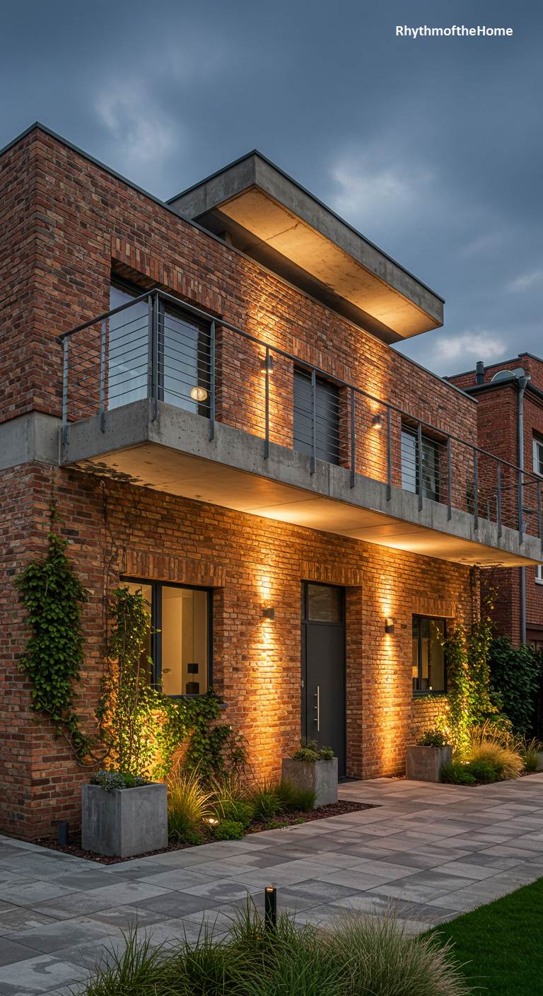 As dusk settles, this modern home glows with a warm, inviting light that accentuates its handsome brick facade. The design marries industrial-chic elements, like the raw concrete balcony and sleek metal railings, with the timeless appeal of classic brickwork. Thoughtfully placed uplights cast a dramatic glow, highlighting the texture of the walls and the climbing greenery that adds a touch of organic softness. The building’s strong, rectilinear form is both imposing and welcoming, creating an atmosphere of sophisticated comfort—a beacon of stylish urban design in the soft evening light.