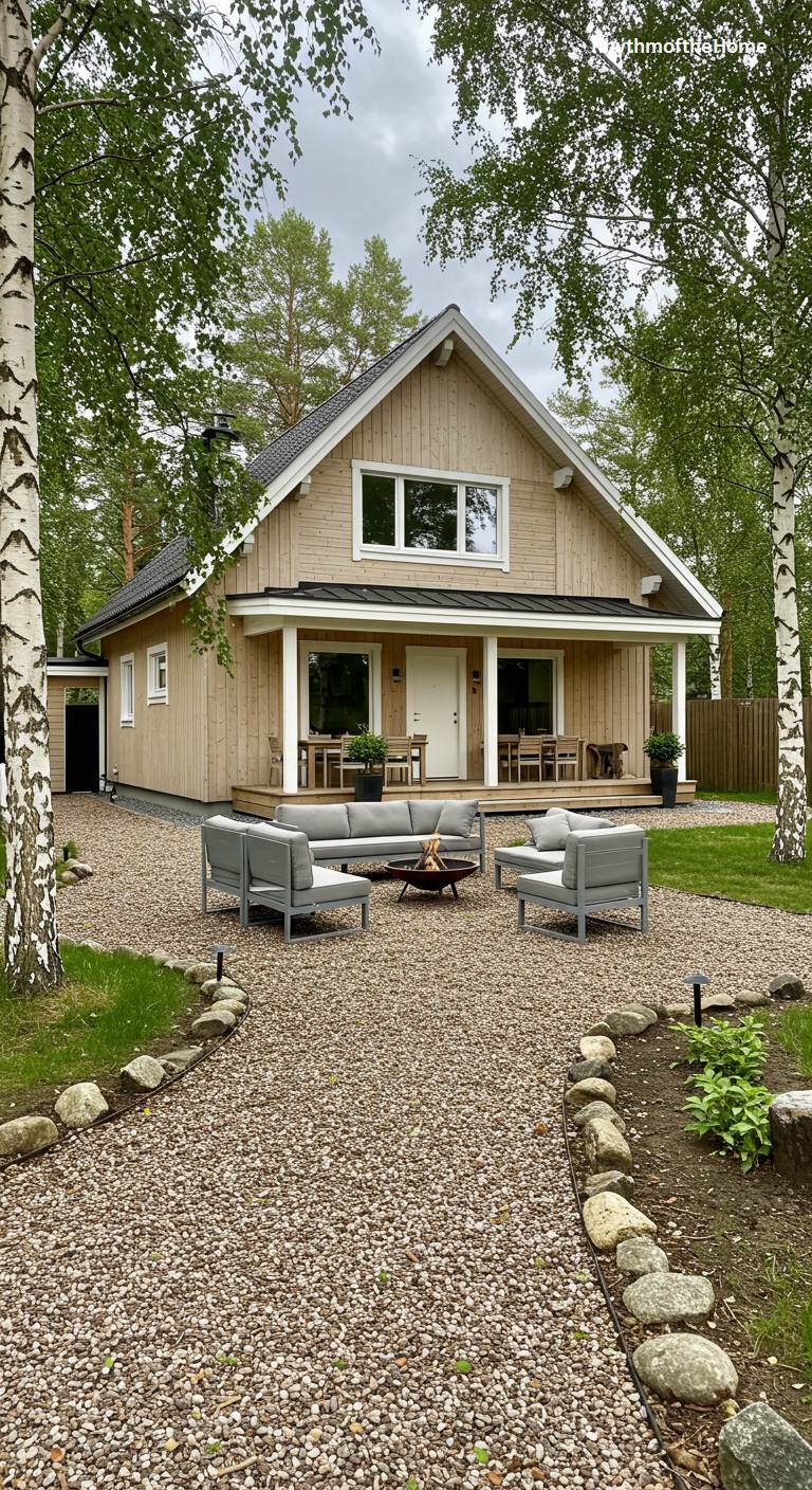 Nestled amongst slender birch trees, this charming modern home reinterprets rustic living with a clean, Scandinavian sensibility. The classic gabled form, clad in light-toned wood siding, exudes a timeless and inviting appeal. A cozy covered porch offers a sheltered spot to enjoy the tranquil surroundings. In the foreground, a simple gravel path winds its way to a contemporary outdoor lounge, where sleek grey furniture encircles a fire pit, creating a perfect hub for social gatherings. This dwelling masterfully balances traditional cottage aesthetics with minimalist design, resulting in a serene and stylish retreat that feels deeply connected to its woodland setting.