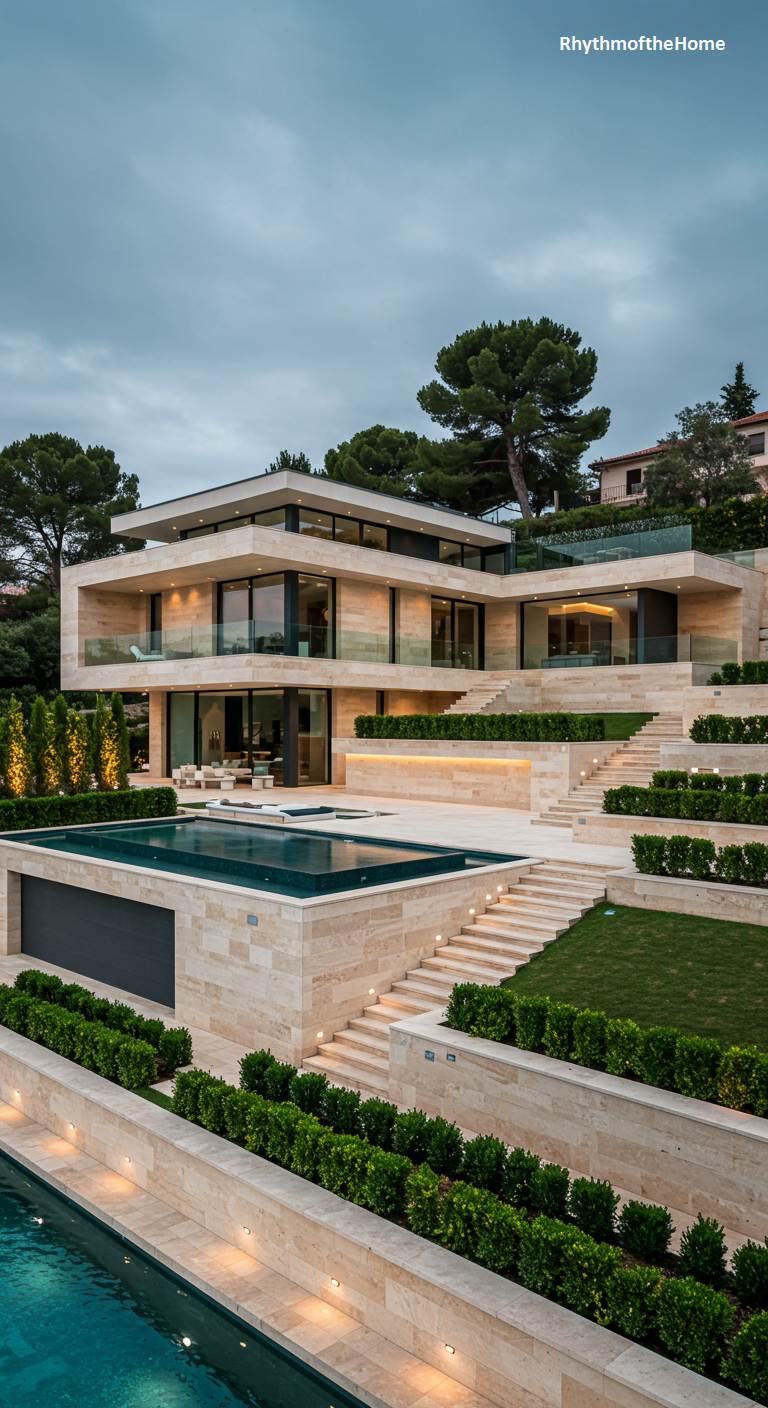 Cascading down a lush hillside, this spectacular modern home is a masterpiece of terraced luxury and architectural ambition. Clad in a creamy, light-toned stone, the structure’s clean horizontal lines create a series of stacked volumes that integrate seamlessly with the landscape. Expansive glass walls erase the boundaries between the opulent interior and the numerous outdoor levels, which feature meticulously manicured gardens, sleek swimming pools, and illuminated stairways. As twilight descends, a sophisticated lighting scheme transforms the villa into a radiant spectacle, highlighting its geometric purity and establishing it as the pinnacle of glamorous living.