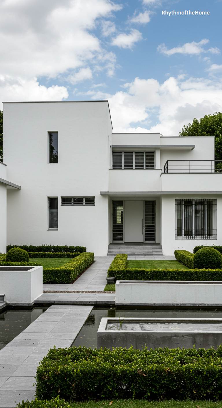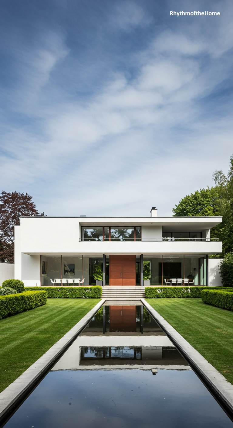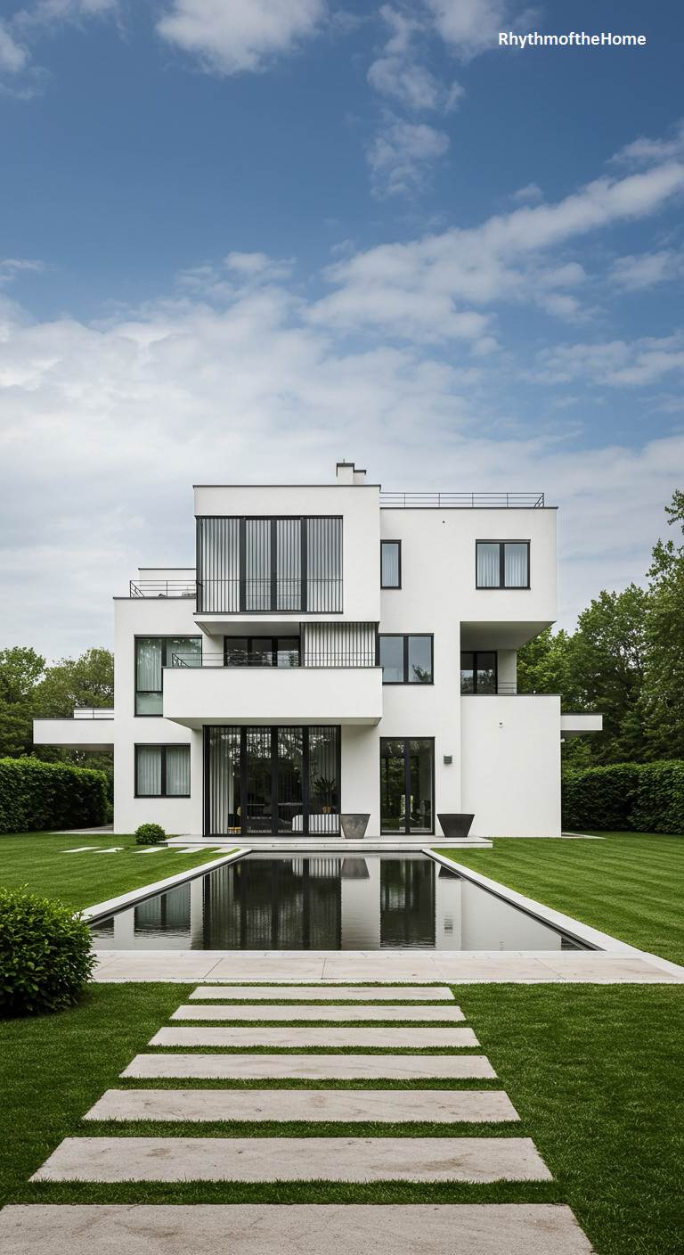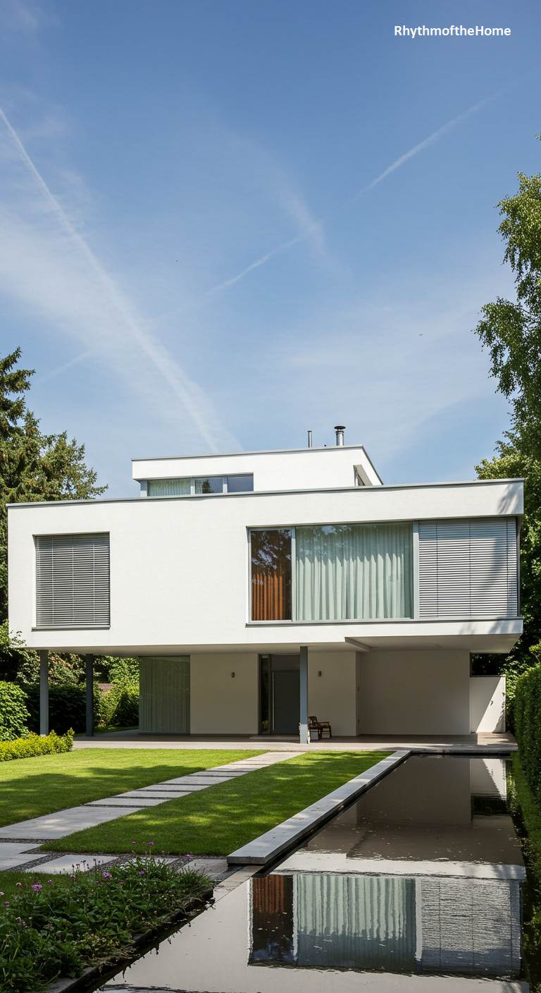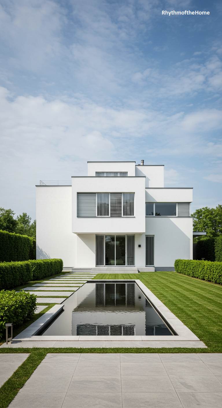 This sleek, multi-layered modern home presents a striking study in minimalist design. The cubic structure, rendered in brilliant white, is defined by clean lines and stacked volumes, reminiscent of a refined Bauhaus aesthetic. A long, rectangular reflection pool at the forefront acts as a tranquil, moat-like entrance, flanked by meticulously trimmed green hedges. Grey stone pavers interrupt the vibrant green lawn, leading the eye toward the central facade, which features dramatic vertical louvers over large windows. The geometry of the architecture is mirrored in the precise lines of the landscape, creating a harmonious and sophisticated visual statement under a bright, cloudy sky.