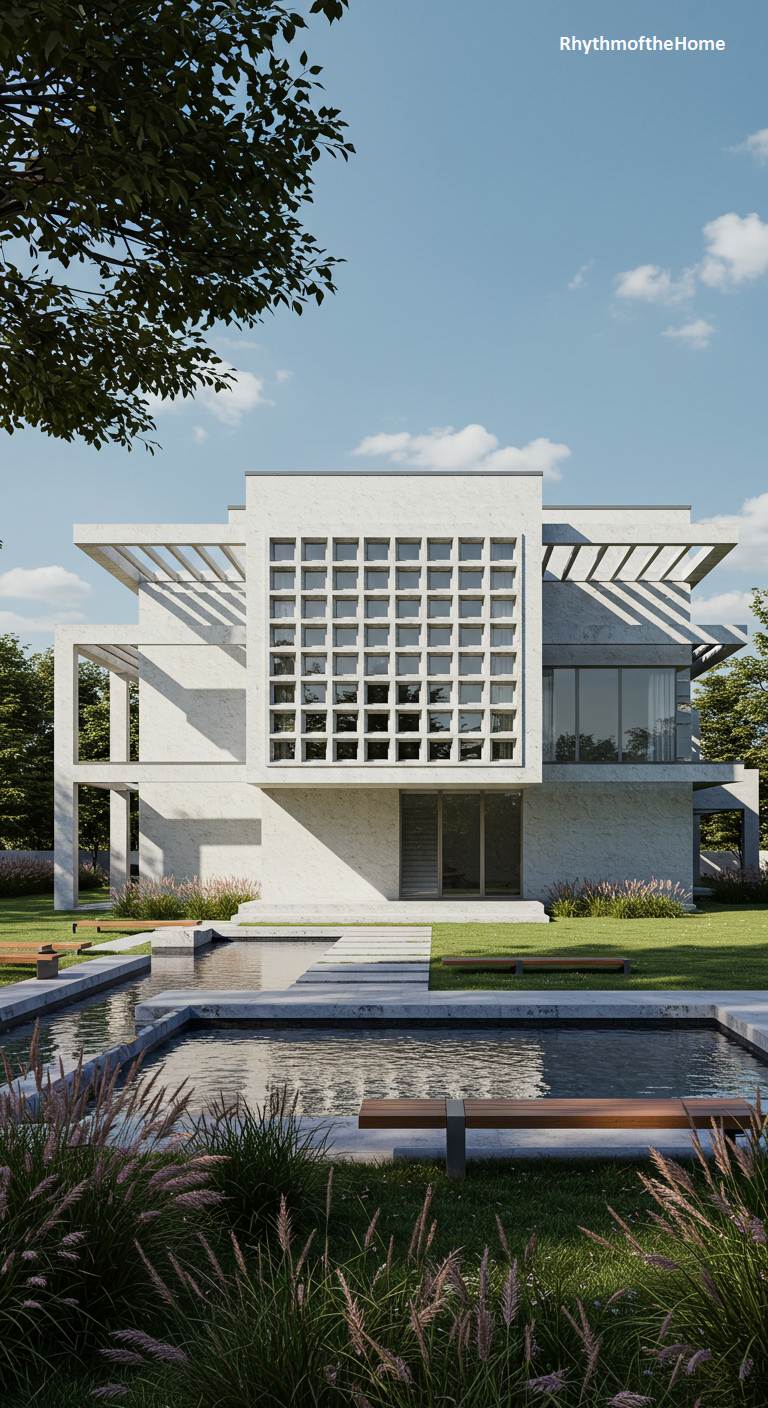 This striking modern home marries minimalist forms with textured, almost Brutalist, elements. The facade is dominated by a large, concrete brise-soleil, a geometric grid that creates a dramatic visual screen over the upper windows. The home’s exterior is finished in a rugged, textured light gray stucco, softened by cantilevered concrete pergolas. The landscape emphasizes tranquility, featuring a serene reflecting pond with floating stone benches, flanked by manicured lawns and wild, flowing grasses. The design cleverly balances harsh architectural lines with the organic shapes of nature, creating a dynamic and visually engaging residence under a bright sky.