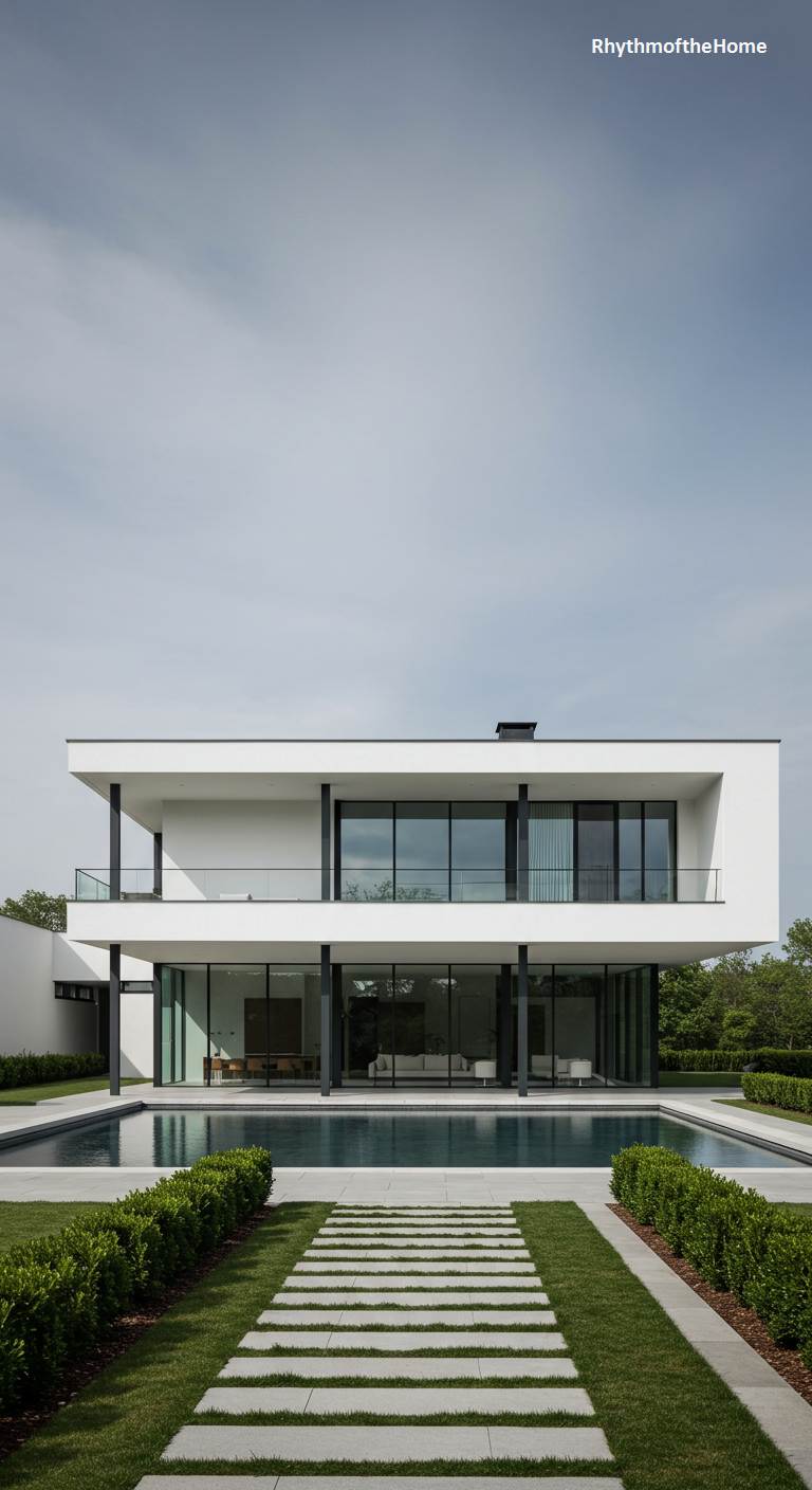 This wide, horizontal modern home embodies sleek minimalism and open-plan design. The stark white facade contrasts with the bold black frames and structural columns supporting the cantilevered second story. The home’s main feature is a seamless wall of floor-to-ceiling glass on both levels, offering panoramic views of the adjacent infinity pool, which acts as a dramatic, dark reflecting surface. The landscape design is equally precise, with twin rows of low, manicured hedges framing the pool and a central stone walkway set against a perfectly maintained lawn. The architecture’s clean lines and extensive transparency foster a deep connection between the sophisticated interior and the serene exterior spaces.