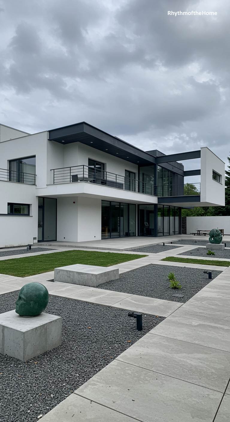 Under a dramatic, overcast sky, this modern home presents itself as a composition of intersecting planes and bold forms. Stark white walls are sharply contrasted by dark grey metal fascia and window frames, creating a powerful graphic statement. A cantilevered second story seems to float, sheltering the spaces below. The landscape is a minimalist’s dream, a carefully arranged grid of grey gravel, concrete plinths, and manicured grass squares. Contemporary sculptures, including a striking green head, are placed with intention, turning the courtyard into an open-air gallery that complements the home’s artistic and intellectual character.