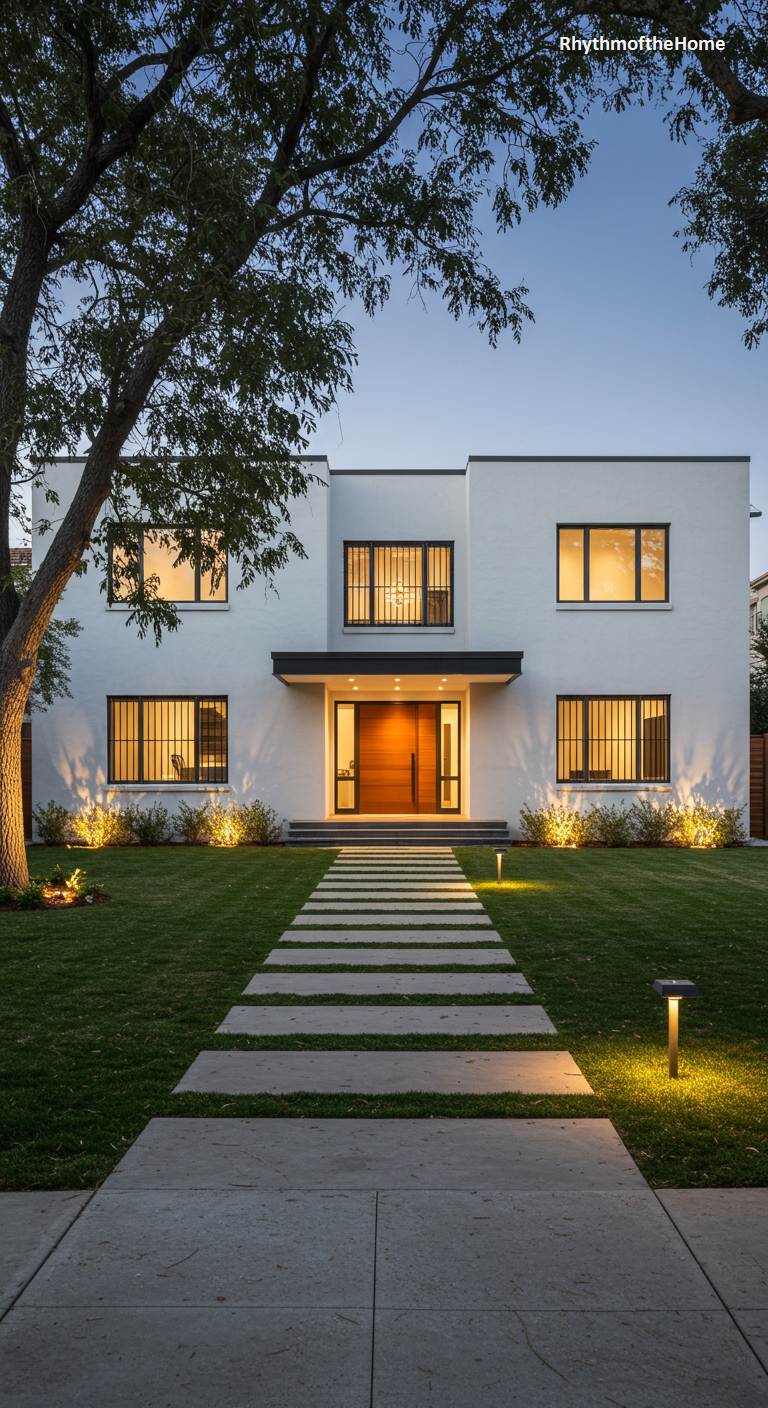 As dusk settles, this modern home radiates a warm and inviting ambiance. The symmetrical facade, with its textured white finish and clean lines, is softened by the golden light spilling from within. A prominent wooden door provides a natural, welcoming focal point, breaking the cool geometry of the structure. Thoughtfully placed landscape lighting casts a gentle glow on the surrounding shrubs and the stepping-stone pathway that cuts through the verdant lawn. The overall effect is one of sophisticated comfort, blending modern design principles with the warmth and security of a cherished family residence.