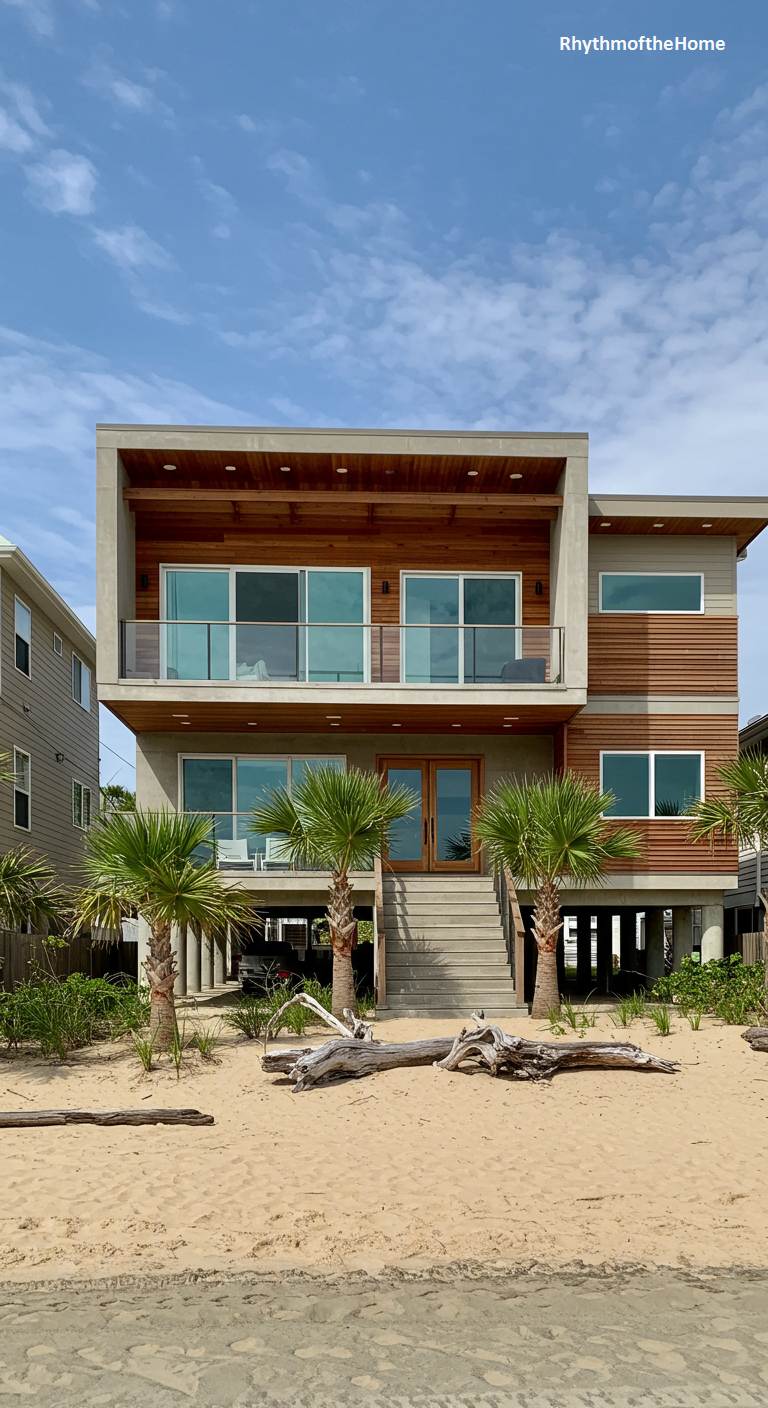 Perched confidently above the sand, this modern home is the epitome of coastal cool. Elevated on stilts to embrace its beachfront location, the structure presents a bold, geometric form crafted from raw concrete, warm wood siding, and expansive glass. The main living spaces open onto generous balconies with clear railings, ensuring unobstructed views of the ocean and sky. Below, the open space provides a sheltered connection to the sandy shore, where small palm trees and weathered driftwood dot the landscape. This is a residence designed for a life of sun and sea, perfectly blending rugged, contemporary design with the laid-back atmosphere of the coast.