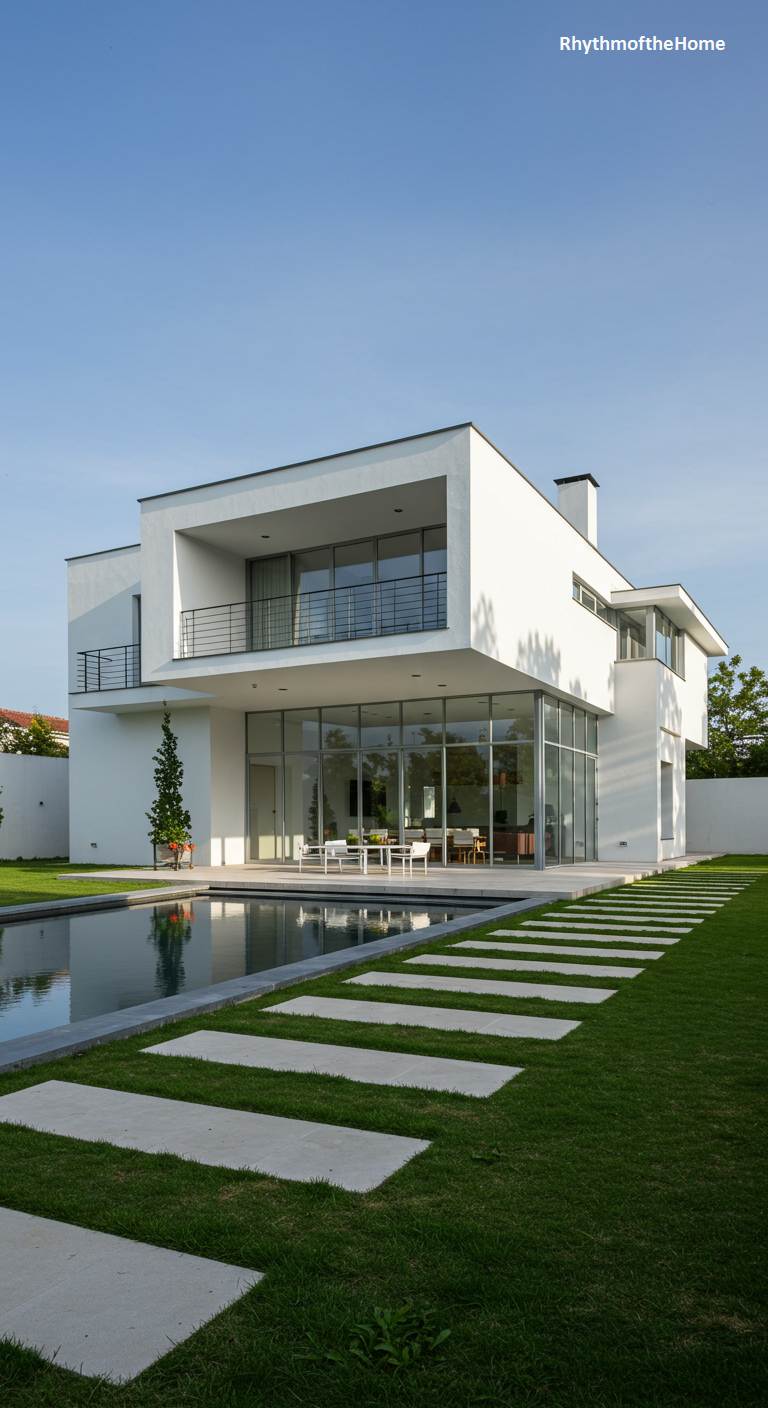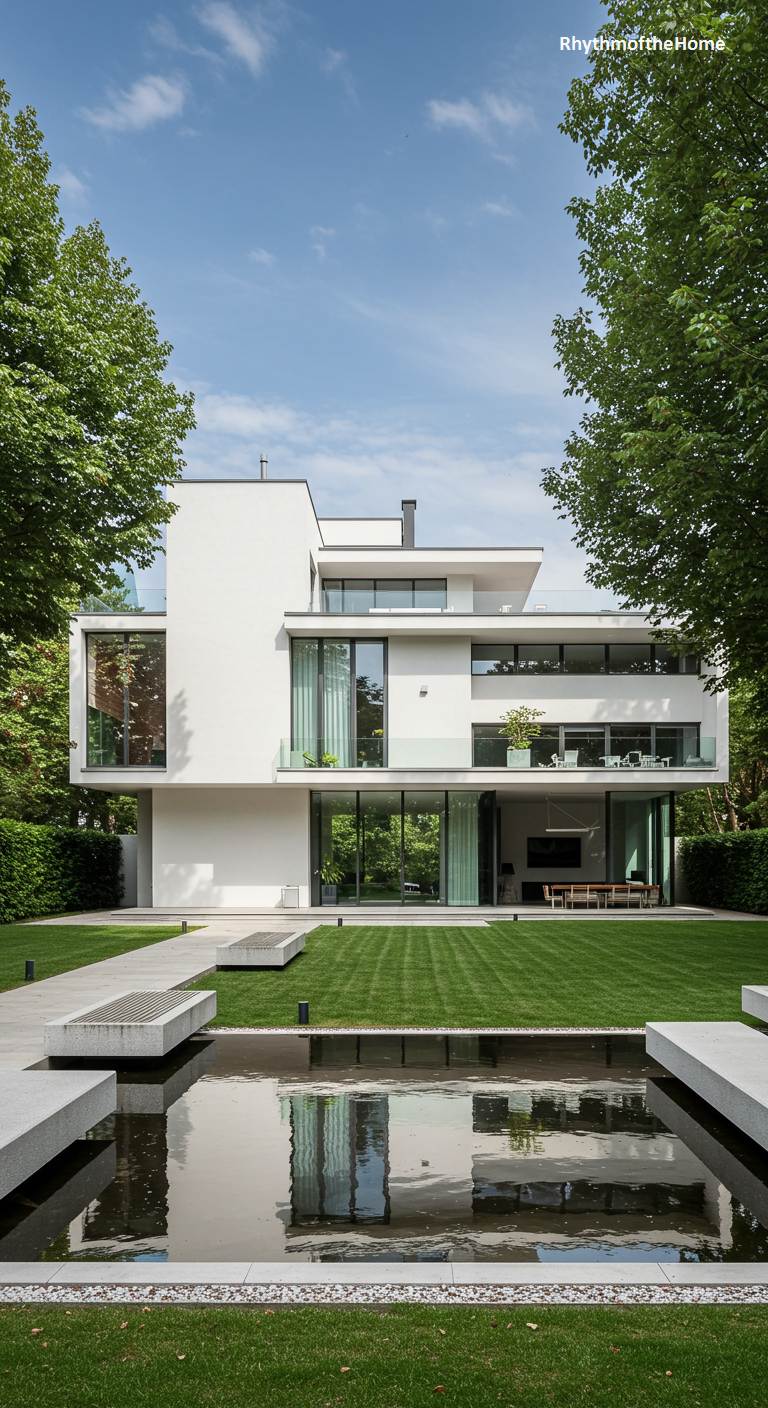 This residence achieves a breathtaking sense of balance and tranquility through its powerful symmetry. The crisp, white cubic forms are stacked with geometric precision, their clean lines defined by black-framed windows and minimalist railings. The home’s flawless facade is perfectly mirrored in the dark, still water of a rectangular pool that acts as the property’s stunning centerpiece. A path of stone pavers leads the eye directly across the immaculate lawn to this point of perfect reflection. Set against a backdrop of lush trees and a serene blue sky, the entire scene exudes an air of calm, order, and refined elegance.
