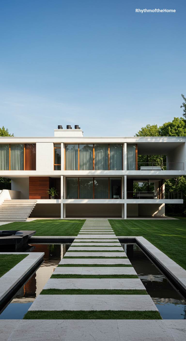 A striking sense of order defines this residence, a pristine white, two-story structure that celebrates horizontal lines and a rigid, almost classical grid. The ground floor’s open pilotis create a feeling of lightness, contrasting with the more enclosed upper level, where sheer curtains soften the interior view. The stark geometry is warmed by a central wooden-clad entrance. In the foreground, a perfectly manicured lawn is bisected by a rhythmic stepping-stone path that appears to float over tranquil reflecting pools. This deliberate composition creates a meditative journey toward the home, where architecture and landscape merge into a single, harmonious expression.