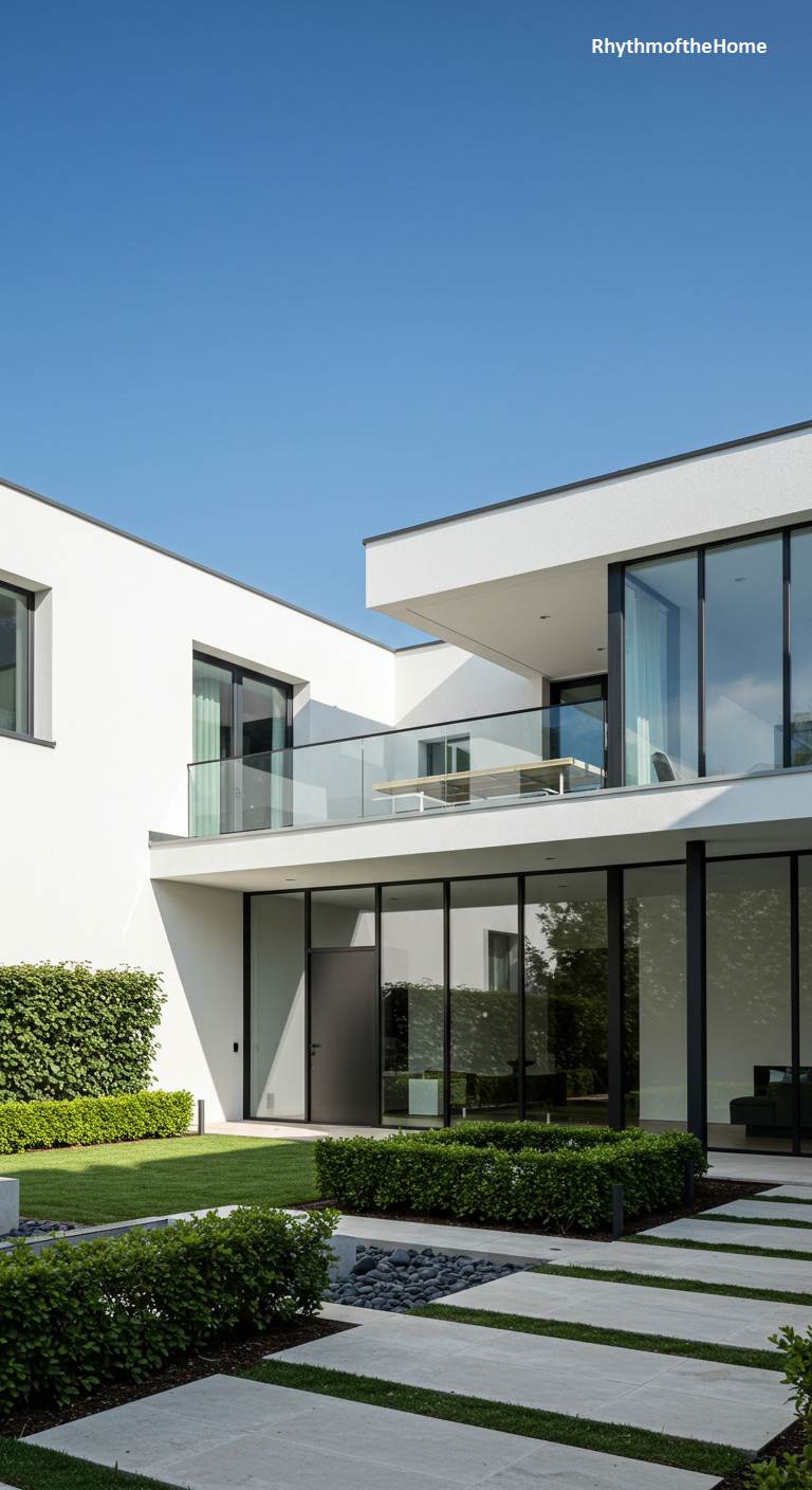 This residence presents a dynamic interplay of clean, white cubic volumes, stacked and offset to create a compelling architectural form. Expansive floor-to-ceiling glass walls and a minimalist glass balustrade on the upper terrace dissolve the boundaries between the interior and the sun-drenched exterior. The sharp geometry of the house is echoed in the meticulously landscaped garden, where neatly trimmed hedges and staggered stone pavers guide the eye. The composition is a study in contrasts—solid against void, stark white against vibrant green—resulting in a sophisticated and light-filled environment that feels both private and open to its surroundings.