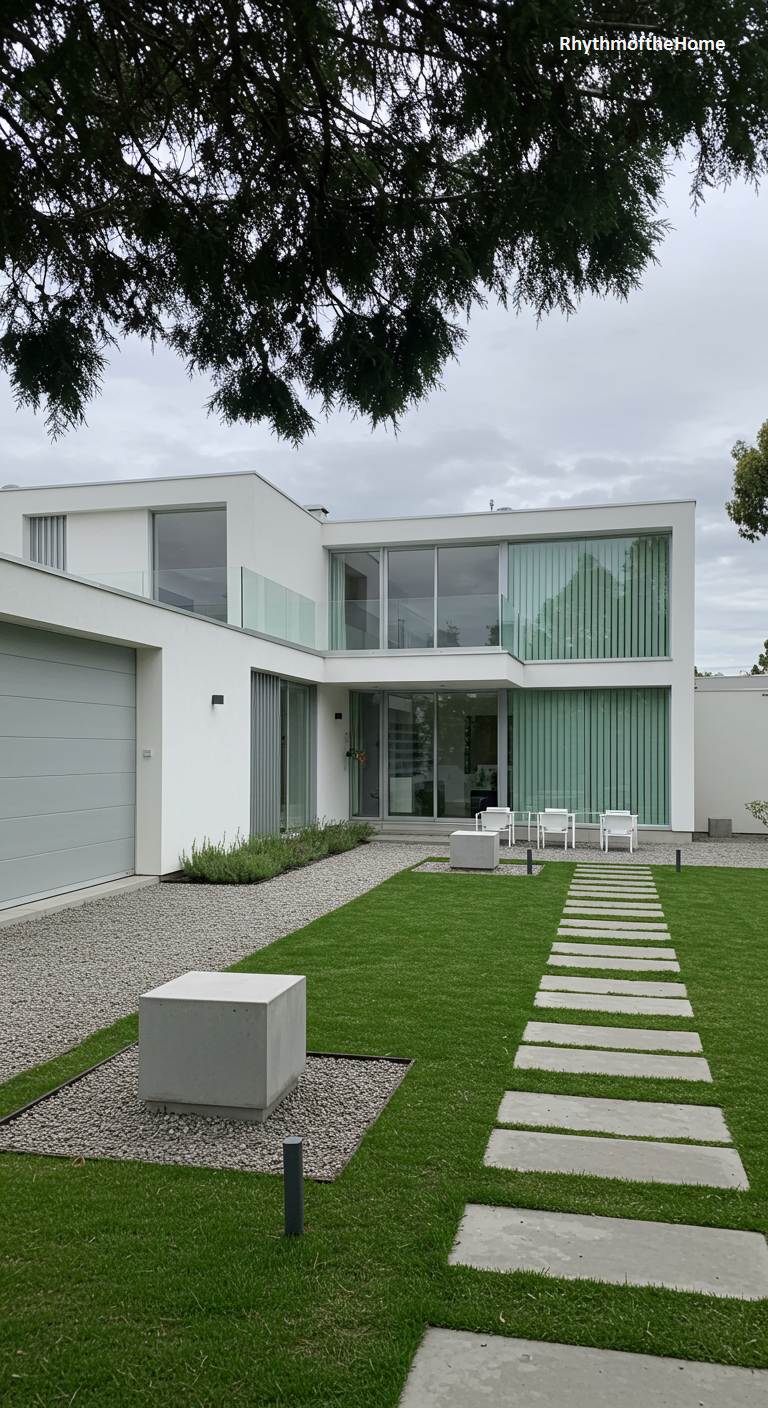 Exuding a cool, contemporary confidence, this L-shaped modern home is an exercise in restraint. The facade is a canvas of pure white, articulated by expansive panes of glass and the subtle texture of vertical blinds. A sleek glass balustrade keeps the upper level feeling light and open, while a muted grey garage door integrates seamlessly into the minimalist palette. The landscaping reinforces this clean aesthetic, with a precise gravel courtyard, a verdant lawn bisected by a geometric stepping-stone path, and a solitary concrete cube acting as a piece of outdoor sculpture. It’s a serene and highly controlled environment, softened only by an overcast sky.