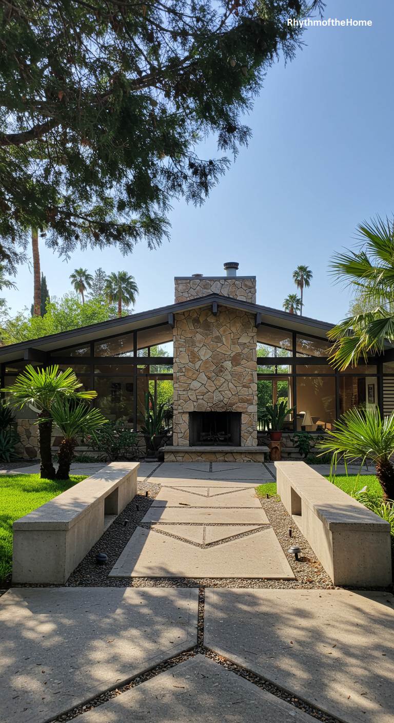 A monumental stone fireplace stands as the powerful heart of this striking mid-century modern home, boldly blurring the line between inside and out. Flanked by soaring walls of glass that reach up to the gabled roofline, the structure feels both transparent and firmly anchored to the earth. Its clean post-and-beam construction is celebrated, showcasing the home’s architectural honesty. A symmetrical concrete path, framed by matching benches, creates a formal, almost ceremonial approach, leading the eye directly to the hearth. Surrounded by palm trees, this residence is a masterful composition of glass, stone, and open space.
