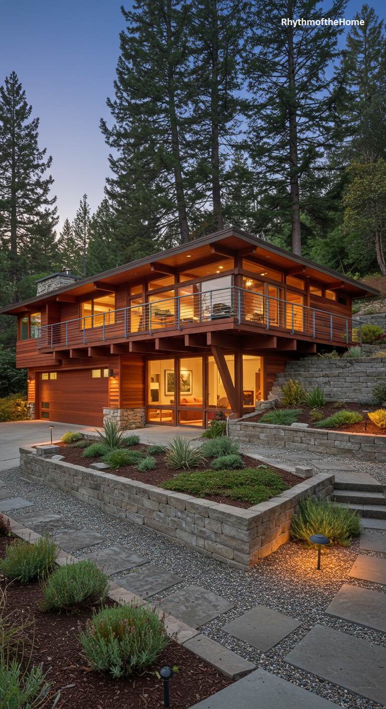 Perched majestically on a forested hillside, this multi-level modern home is a triumph of site-specific design. Its warm wood cladding and expansive walls of glass seem to grow organically from the landscape, embraced by towering evergreen trees. A generous wrap-around deck with sleek railings offers a breathtaking perch, dissolving the boundaries between the sophisticated interior and the rugged outdoors. The structure’s strong horizontal lines are balanced by the verticality of the forest, while stacked stone retaining walls and carefully lit pathways carve an elegant human presence into the sloped terrain, creating a sanctuary designed for dramatic views.