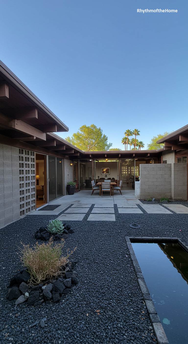 This modern home turns inward, creating a secluded oasis within its U-shaped embrace. The central courtyard acts as the true heart of the residence, an outdoor room seamlessly connected to the interior through expansive sliding glass doors. Deep, protective overhangs with exposed wood beams offer respite from the sun, casting dramatic shadows across the textured concrete block walls. The landscaping is a minimalist composition of dark lava rock, a solitary succulent, and a tranquil water feature, emphasizing a Zen-like calm. This design prioritizes privacy and a profound connection to a controlled slice of nature.
