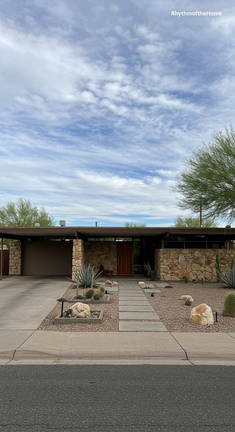 This low-slung modern home settles into its arid landscape as if it grew from the earth itself. Walls of rough, warm-toned fieldstone anchor the structure, beautifully contrasting with the clean, dark lines of the flat roof and carport. The architecture embraces the desert, with large windows peering out from under deep eaves that offer respite from the sun. A xeriscaped garden, dotted with resilient agaves, barrel cacti, and sculptural boulders, replaces a traditional lawn. A pathway of simple concrete pavers guides you toward a rich wooden door, promising a cool and serene sanctuary within this masterpiece of organic modernism.