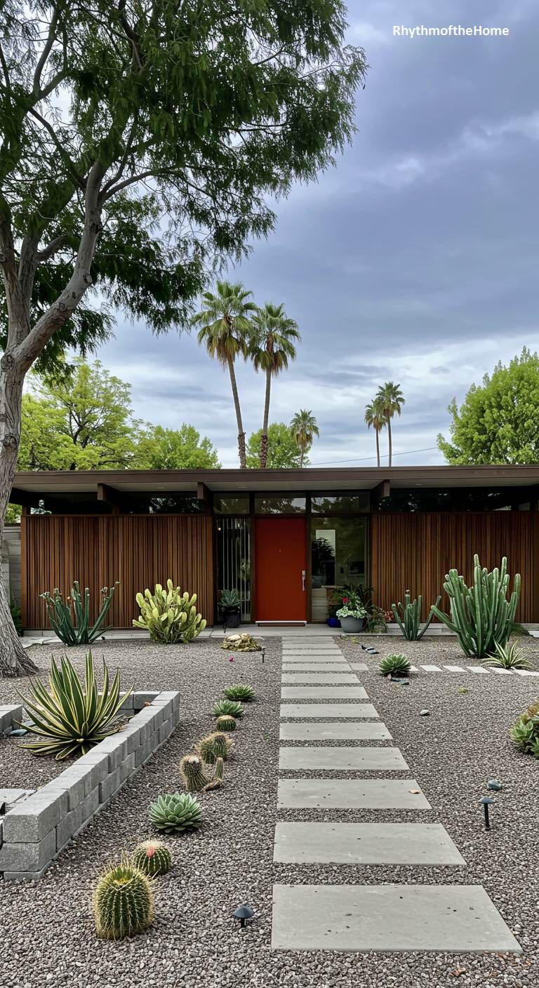 Clean lines and natural materials define this inviting mid-century modern home. A facade of vertical wood siding provides a warm, organic texture, beautifully framed by a dark, flat roofline that emphasizes the home’s horizontal connection to the land. Floor-to-ceiling glass panels dissolve the barrier between inside and out, offering glimpses of the interior space. The landscaping is a thoughtfully curated desert rock garden, where cacti and succulents of various shapes and sizes are arranged with artistic precision. A single, bold stroke of vibrant orange on the front door serves as a cheerful, welcoming beacon, adding a playful personality to the sophisticated design.