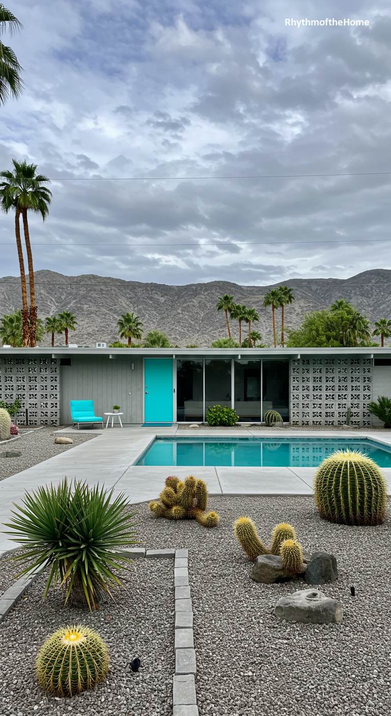 This is the quintessential desert modern home, a stylish oasis set against a dramatic mountain backdrop. The home itself is a study in minimalist geometry, featuring a clean white-and-gray color palette, a decorative breeze block wall, and vast panes of glass that open onto the patio. The turquoise swimming pool is the glittering heart of the scene, its cool blue tones echoed in the vibrant front door and a lone, chic armchair. The surrounding garden is a masterclass in desert landscaping, with golden barrel cacti and sculptural succulents artfully placed in a bed of gravel, creating a tranquil and effortlessly cool retreat.