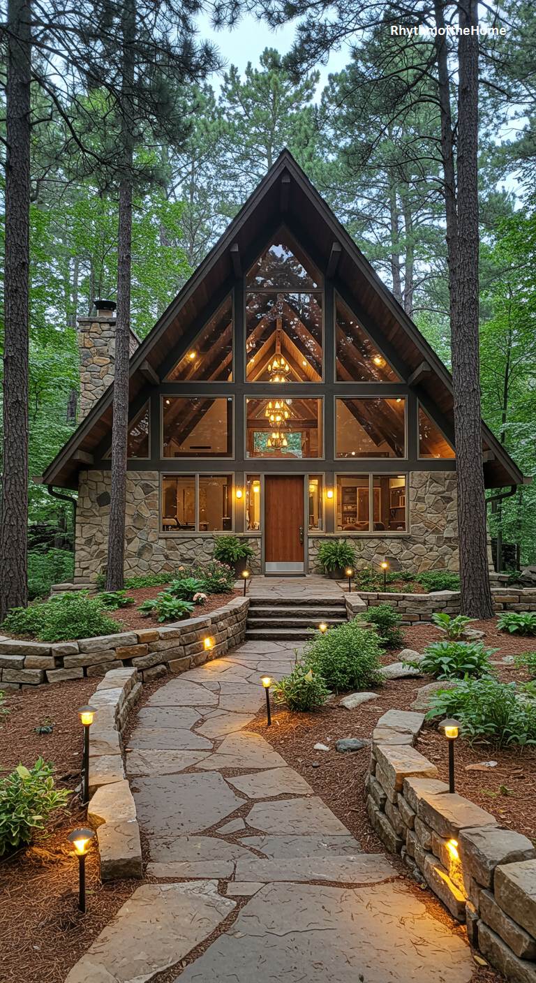 Nestled deep within a tranquil pine forest, this modern A-frame home rises toward the canopy like a cathedral of wood and glass. Its dramatic, steeply pitched roofline culminates in a massive glazed gable, revealing a warm, light-filled interior and a magnificent chandelier. The home’s foundation of rugged, natural stone grounds the soaring structure, creating a harmonious blend of rustic materials and contemporary design. As dusk settles, a winding flagstone path, illuminated by gentle landscape lighting, creates a magical and inviting journey through the woods, leading to the sanctuary of this breathtaking architectural haven.