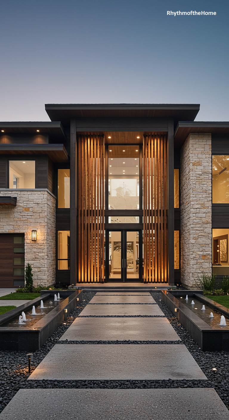 This modern home announces its presence with a grand, theatrical entryway that masterfully balances natural materials and imposing scale. Symmetrical stone-clad columns anchor the structure, while a soaring glass facade is veiled by a dramatic screen of vertical wooden louvers, creating a captivating play of light and shadow. A carefully orchestrated path of floating concrete slabs guides visitors over dark river rock, flanked by bubbling fountains that add a sensory layer of sound and movement. Strategic up-lighting accentuates the warmth and texture of the wood, crafting a breathtaking welcome that promises architectural splendor within.
