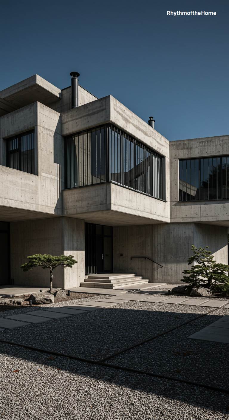 This monumental modern home is a powerful statement of form and material. Composed of stark, raw concrete, its structure is a complex interplay of interlocking geometric volumes, cantilevered sections, and sharp, uncompromising angles. The massive concrete planes are punctuated by large, recessed windows with thin black frames, creating a rhythmic pattern of solid and void. The minimalist, Zen-inspired landscaping—a sea of gravel with carefully placed rocks and sculpted bonsai-like trees—complements the building’s austere aesthetic. Under a clear, dark blue sky, the home stands as a sculptural masterpiece, celebrating the bold and unadorned beauty of Brutalist architecture.