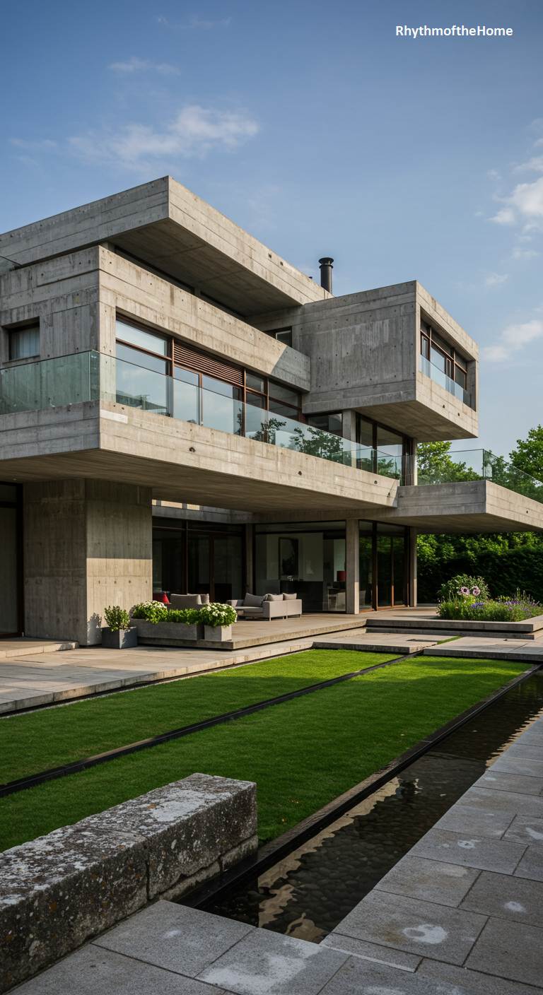 This modern home presents a striking composition of stacked concrete volumes, with deep, cantilevered balconies creating a dynamic interplay of light and shadow. The raw, powerful lines of the Brutalist-inspired architecture are softened by expansive glass walls and sleek railings, blurring the distinction between inside and out. The rigid geometry of the structure is mirrored in the meticulously manicured landscape below, where a pristine lawn is bisected by a long, narrow reflecting pool. This tranquil water feature, flanked by stone patios and minimalist planters, creates a serene dialogue between the imposing structure and the ordered calm of the garden.