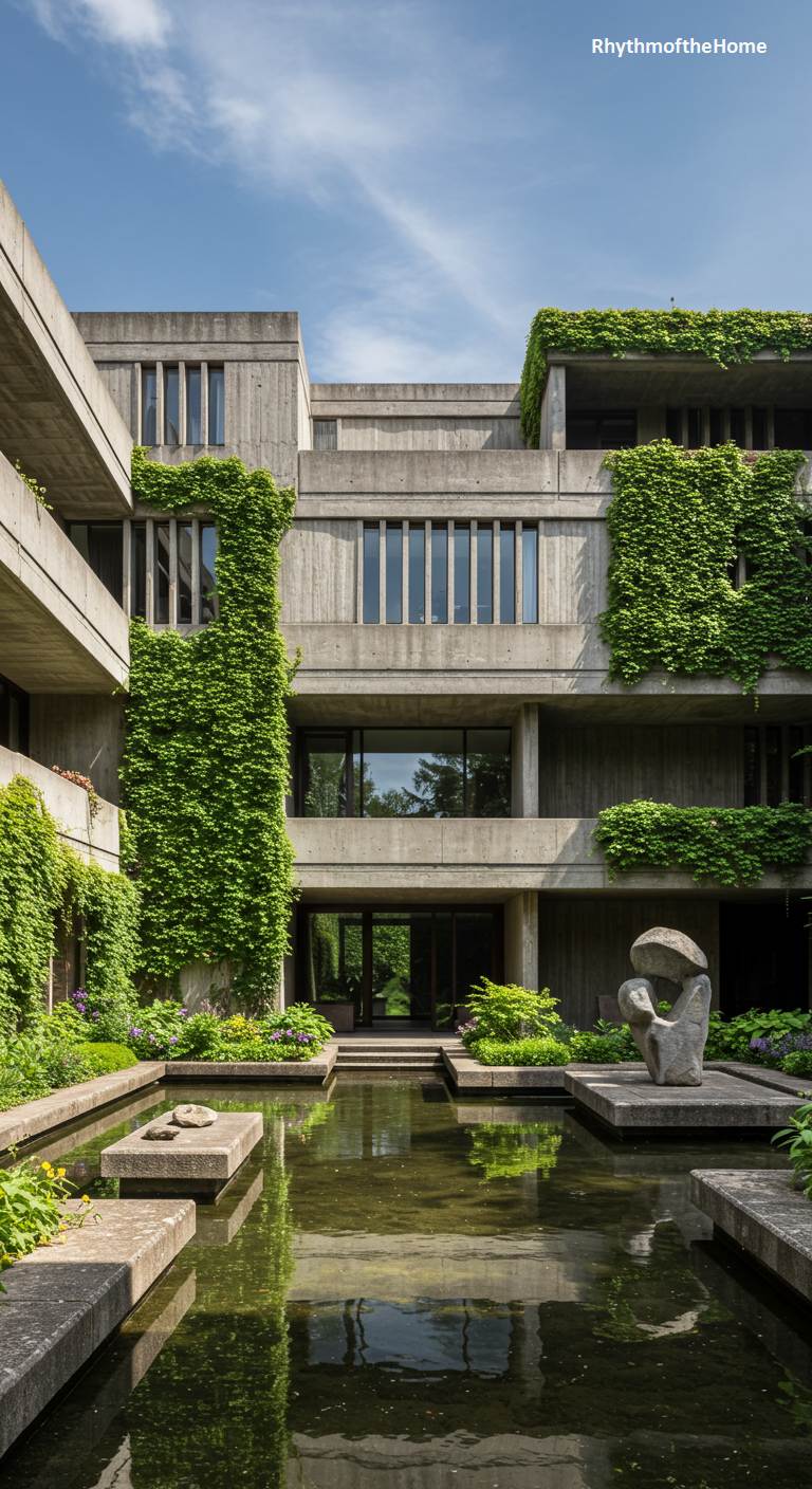 Emerging from a lush, shaded courtyard, this Brutalist modern home feels like a lost temple reclaimed by nature. Sheets of vibrant green ivy cascade down the textured concrete facade, softening its formidable and complex geometry. A dark, contemplative reflecting pool occupies the central space, its still surface broken by concrete plinths and a solitary abstract sculpture that seems to rise from the depths. The interplay of rigid architecture, untamed verdant life, and placid water crafts a secret, almost monastic sanctuary, offering a quiet and introspective escape from the world outside its imposing walls.