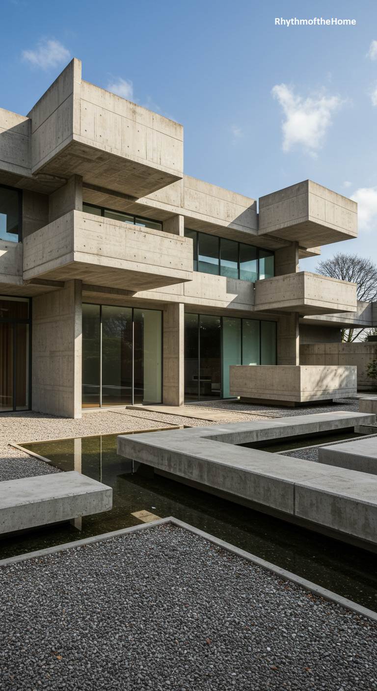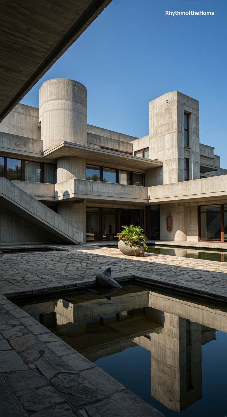 This structure is a powerful testament to Brutalism, conceived as a sculpture for living. Cantilevered concrete blocks stack and jut out in a complex, almost labyrinthine arrangement, creating a dynamic play of light and deep shadow against the clear blue sky. The building’s raw, board-formed texture gives it an honest, unyielding presence. Below, a tranquil water feature filled with dark pebbles mirrors the sharp angles, its surface crossed by minimalist concrete walkways. The stark geometry is softened only by the reflections and the glass walls that offer glimpses into the interior, making the home a monumental yet intimate space.