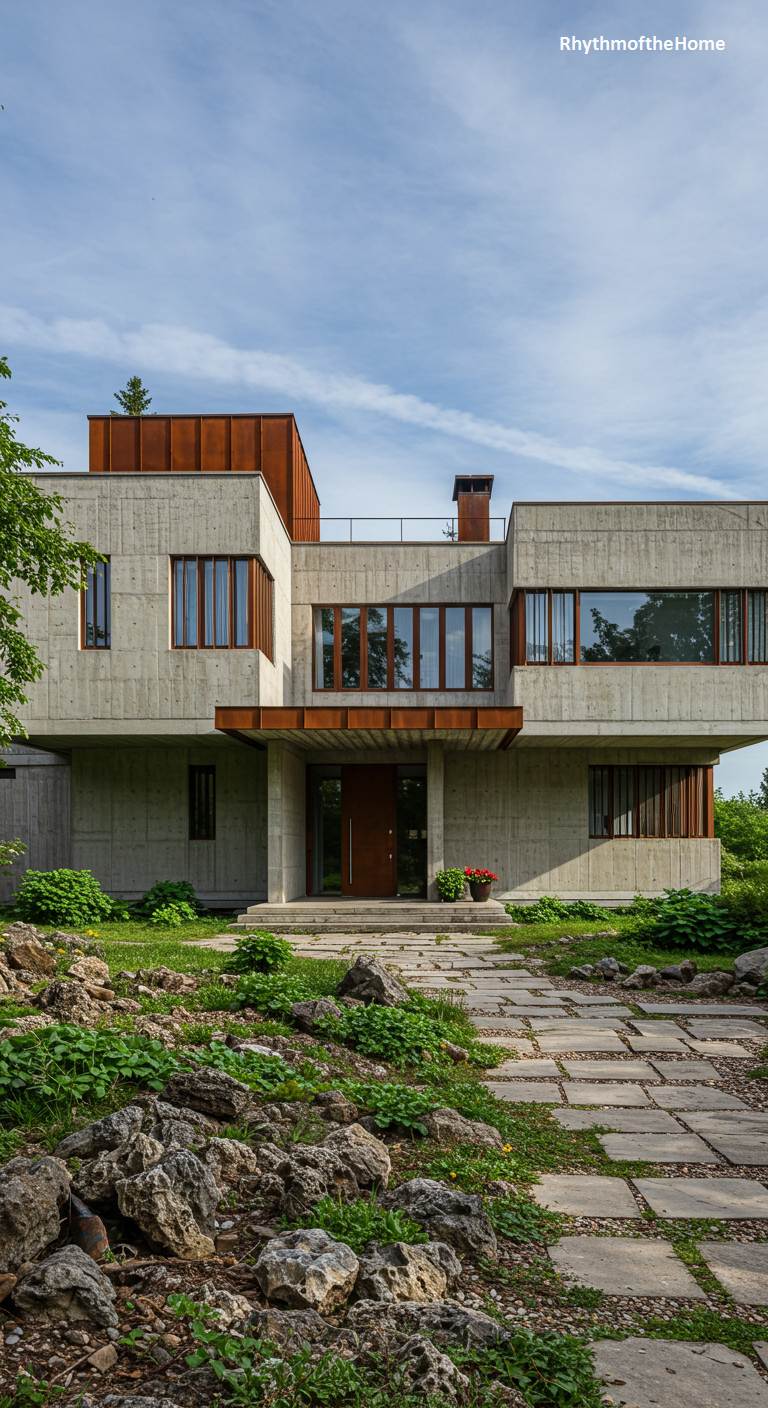 Presenting a striking dialogue between industrial and natural elements, this residence feels deeply rooted in its environment. The robust, raw concrete structure is crowned and accented with panels of weathered Corten steel, whose rich, rusty patina complements the warm tones of the wooden window frames. Rather than a manicured lawn, the home is embraced by a rugged, untamed landscape of rocks and wild greenery, with a simple path of stone slabs leading to the entrance. The asymmetrical composition and the frank display of materials give this home a grounded, powerful, and distinctly organic character.
