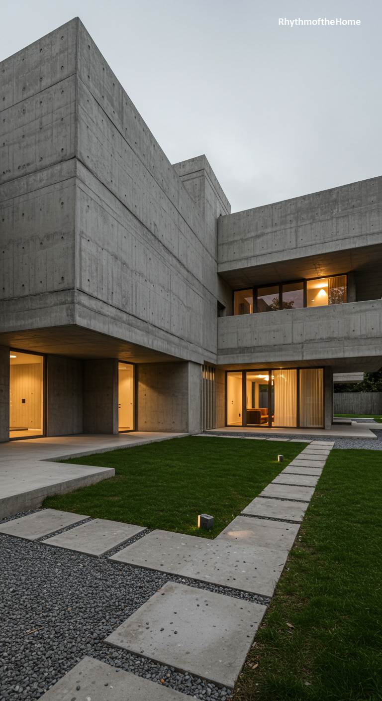 As dusk settles, this minimalist home showcases a captivating contrast between its austere exterior and its warm, inviting interior. The building is a study in clean lines and powerful forms, with massive concrete volumes cantilevering over glass-walled ground floors, creating sheltered outdoor spaces and a sense of layered depth. A precisely arranged landscape of green lawn, grey gravel, and geometric concrete pavers leads the eye through the serene space. The warm glow from within spills out onto the cool grey surfaces, transforming the monumental structure into a beacon of comfort and domesticity against the evening sky.