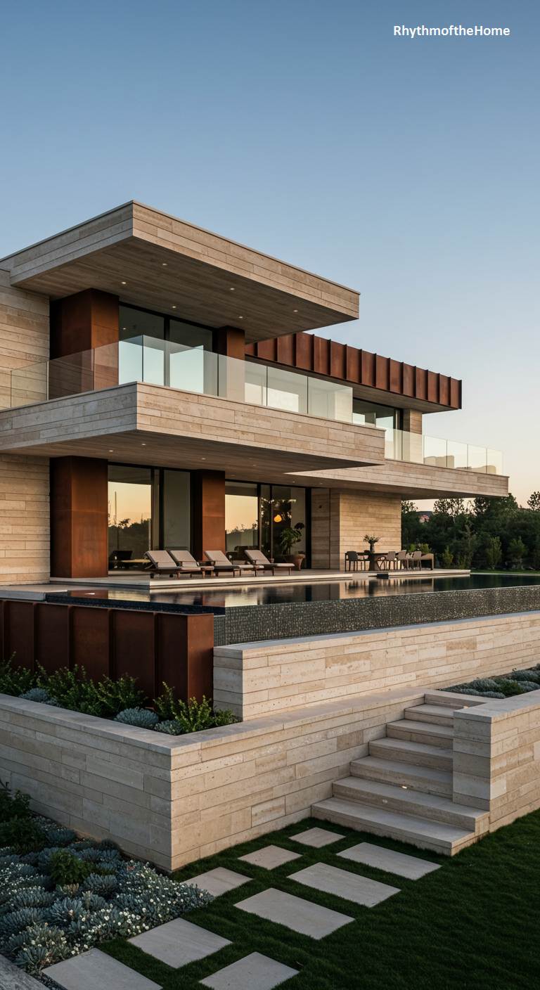 This modern home is a symphony of clean, horizontal lines and warm, natural materials. Stacked levels of light-colored stone create expansive terraces, each one reaching out into the golden hour sky. The design masterfully balances solid mass with transparent glass walls, blurring the line between the luxurious interior and the breathtaking exterior. Accents of rusted Corten steel add a layer of rugged texture, contrasting beautifully with the smooth stone and reflective infinity pool. Tiered landscaping with stone retaining walls and carefully placed greenery integrates the structure into its environment, creating a residence that feels both monumental and intimately connected to its perch.