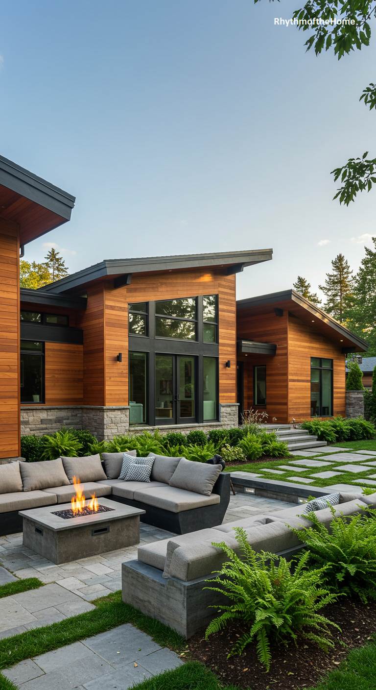 Embracing its woodland setting, this modern home feels like a natural extension of the forest. The architecture is defined by its dynamic, angular rooflines and deep overhangs, clad in warm-toned wood siding that glows in the late afternoon sun. A foundation of rugged, stacked stone anchors the structure to the earth, while large black-framed windows open the interior to the lush surroundings. The outdoor patio, complete with comfortable seating around a crackling fire pit, becomes the heart of the home—an inviting space where contemporary design meets the timeless comfort of nature, surrounded by verdant ferns and manicured lawns.