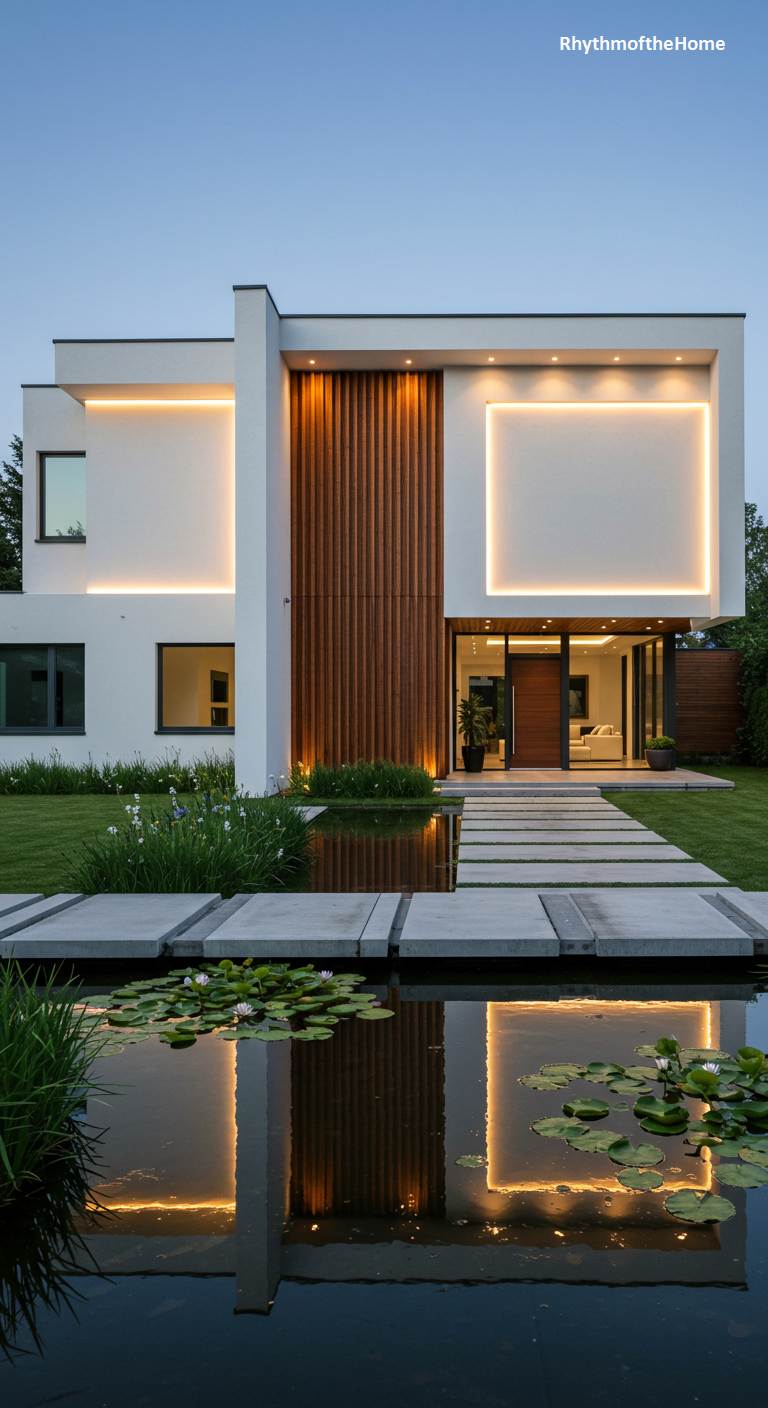 Poised at the edge of twilight, this minimalist modern home is a study in geometric purity and light. Its stark white, cubist form is softened by a central accent of warm, vertical wood slats, creating a focal point that draws the eye towards the welcoming, glass-fronted entrance. What truly defines this residence is its artful use of illumination; recessed LED strips trace the building’s clean lines, casting a sophisticated glow that is beautifully mirrored in the tranquil water lily pond below. A pathway of floating stone pavers leads across the water, transforming the simple act of arrival into a serene, almost magical experience.