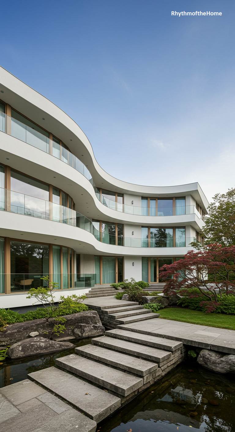 This stunning modern home eschews rigid angles in favor of graceful, sweeping curves that ripple across its multi-level façade. The pure white structure flows like a sculpture, with undulating balconies and vast expanses of curved glass that create a seamless connection with the meticulously designed landscape. The effect is one of organic elegance, a building that feels both dynamic and serene. This sense of peace is amplified by the Japanese-inspired garden at its base, where a tranquil pond, weathered stones, and a vibrant red maple create a contemplative oasis, with a floating stone path inviting one to wander and reflect.