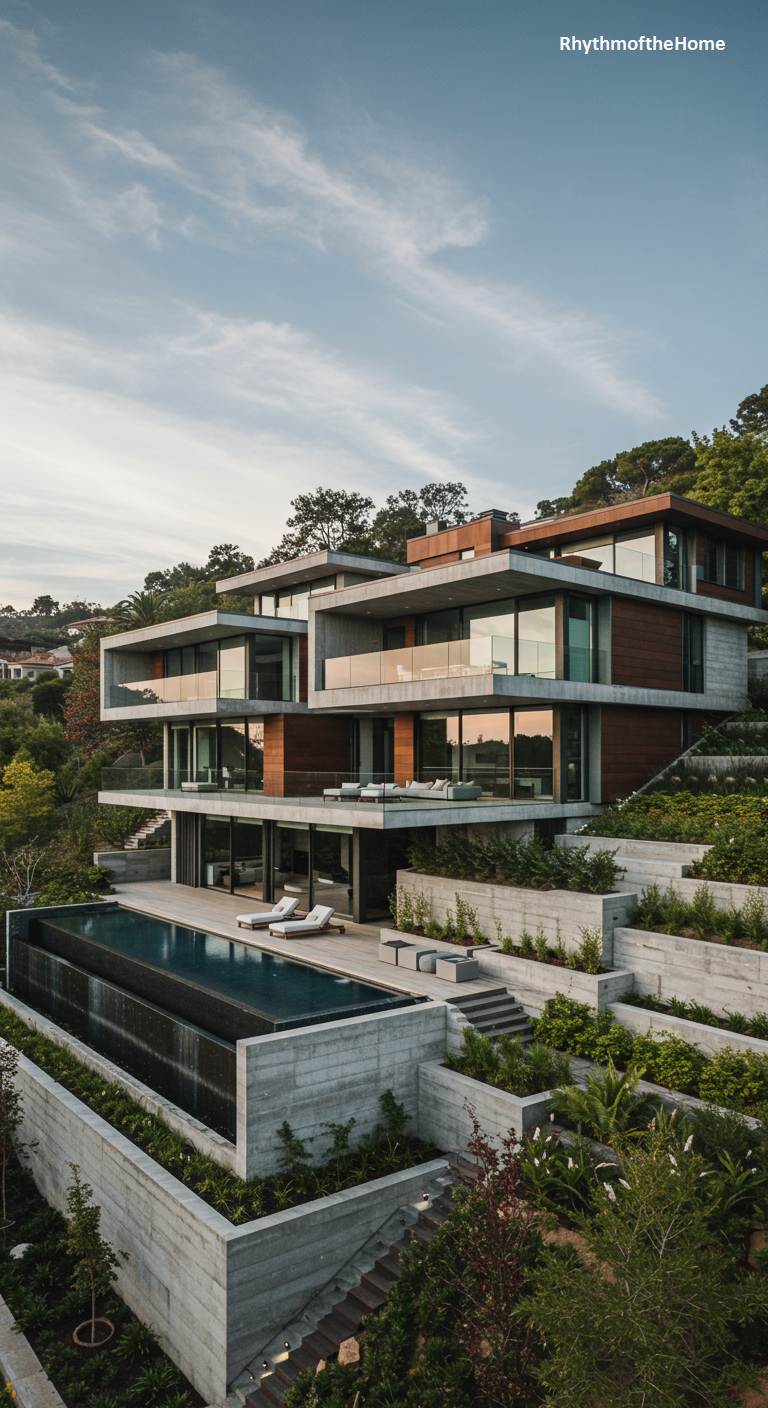 Carved into a dramatic hillside, this modern home is a breathtaking composition of interlocking volumes cascading towards the valley below. The primary material is raw, board-formed concrete, lending the structure a powerful, monolithic presence that is both rugged and refined. This robust frame is strategically punctuated with warm wood paneling and vast walls of glass, opening up the interior to sweeping views and flooding the spaces with natural light. Multiple terraces, including a stunning deck with a long infinity pool, step down the slope, creating a series of private outdoor sanctuaries seamlessly integrated into the lush, tiered gardens.