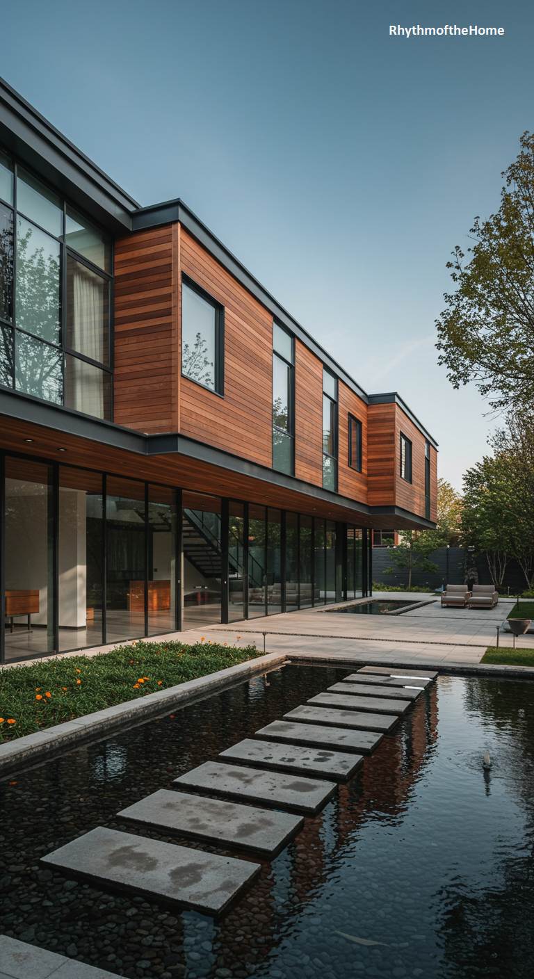 Warmth and serenity define this modern home, where natural wood cladding harmonizes with the cool sleekness of black metal frames and vast glass panels. The structure appears to float alongside a tranquil water feature, its facade reflected in the still, dark surface below. A path of minimalist concrete stepping stones invites a mindful journey across the water, leading the eye towards the light-filled interior. This is a home designed as a peaceful retreat, a place where the organic texture of wood, the clarity of glass, and the gentle presence of water combine to create a deeply calming and sophisticated architectural experience.