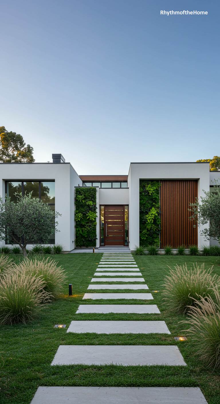 Presenting a perfectly balanced welcome, this modern home’s entrance is a study in clean symmetry and organic integration. A central path of precisely laid concrete slabs cuts through a lush green lawn, guiding visitors toward a warm, multi-paneled wooden door. The crisp white structure is softened by two magnificent vertical gardens, or living walls, that flank the entryway, breathing life and vibrant green texture into the minimalist design. This thoughtful fusion of rigid geometry with thriving plant life creates an inviting threshold, promising a space where nature and contemporary design coexist in beautiful harmony.