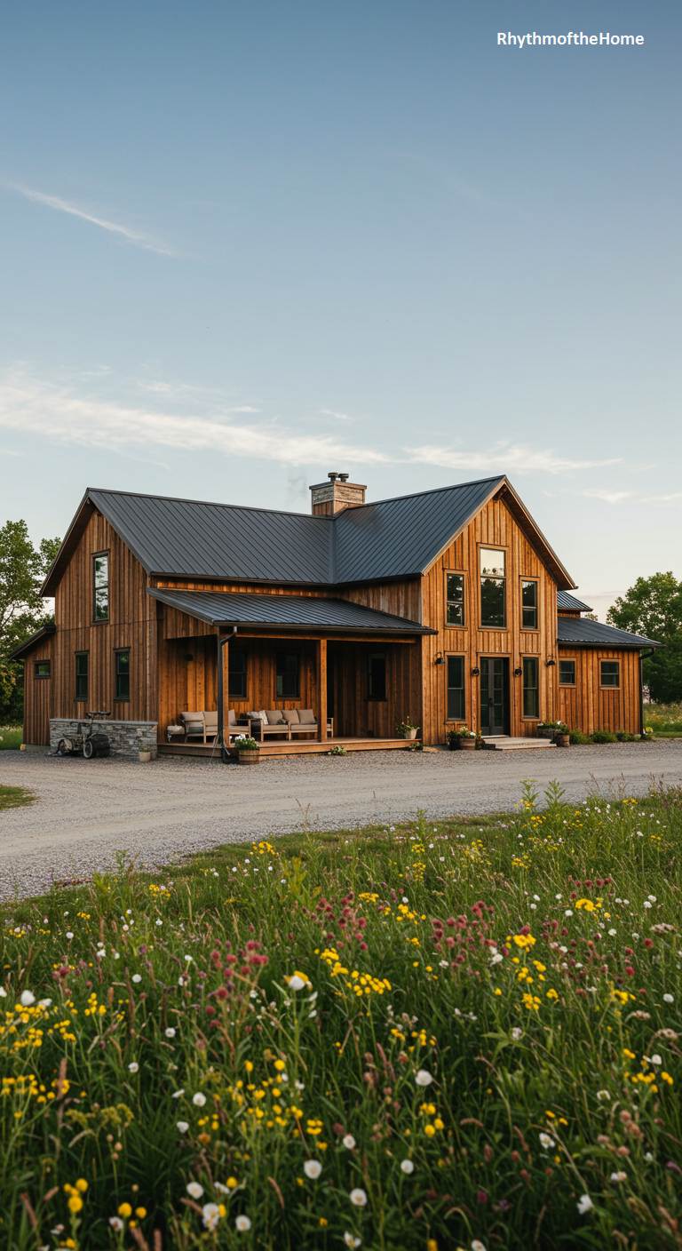 This modern home beautifully reinterprets the classic American barn, blending rustic charm with clean, contemporary lines. Its vertical wood siding and dark metal roof pay homage to traditional agricultural buildings, while expansive windows ground the structure firmly in the present. Set against a backdrop of open country and a field of vibrant wildflowers, the home feels organically connected to its rural landscape. A welcoming covered porch, furnished for relaxation, offers a perfect vantage point to survey the peaceful surroundings, encapsulating a lifestyle of simple elegance, modern comfort, and a deep appreciation for the land.