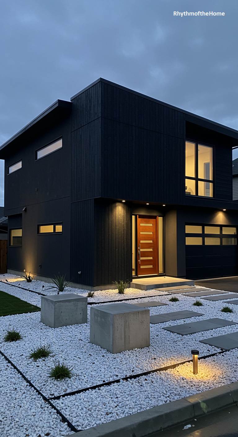 Under a dramatic twilight sky, this modern home presents a bold and enigmatic silhouette. Its facade, clad in dark vertical siding, creates a monolithic and powerful statement, absorbing the fading light. The structure’s severe geometry is punctuated by strategically placed windows that glow with a warm, inviting light, offering a tantalizing glimpse of the life within. Minimalist landscaping, featuring stark white gravel, simple concrete blocks, and subtle uplighting, enhances the home’s contemporary aesthetic. This is a residence of striking contrasts—dark and light, solid and transparent—that exudes a quiet, confident sophistication.