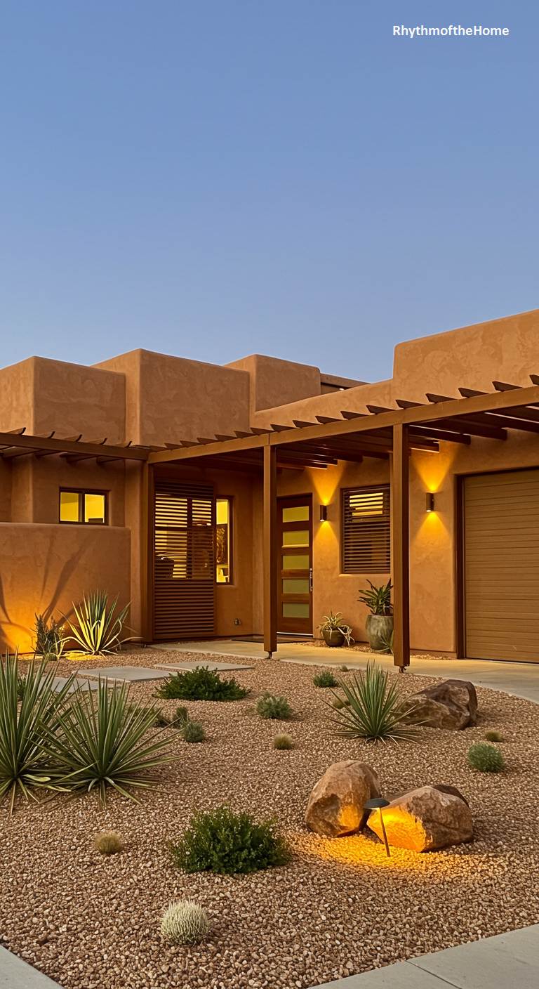 Bathed in the soft glow of twilight, this modern home melts into its desert surroundings. The warm, terracotta-hued stucco walls echo the tones of the gravel xeriscape, creating a seamless transition from structure to nature. A dark wood pergola casts linear shadows, adding depth and geometry to the facade. Thoughtfully placed lighting illuminates native yuccas and rugged boulders, transforming the landscape into a living sculpture. The home’s clean lines and flat roofs are a contemporary take on classic Southwestern architecture, offering a sanctuary of serene and understated elegance under a vast, clear sky.
