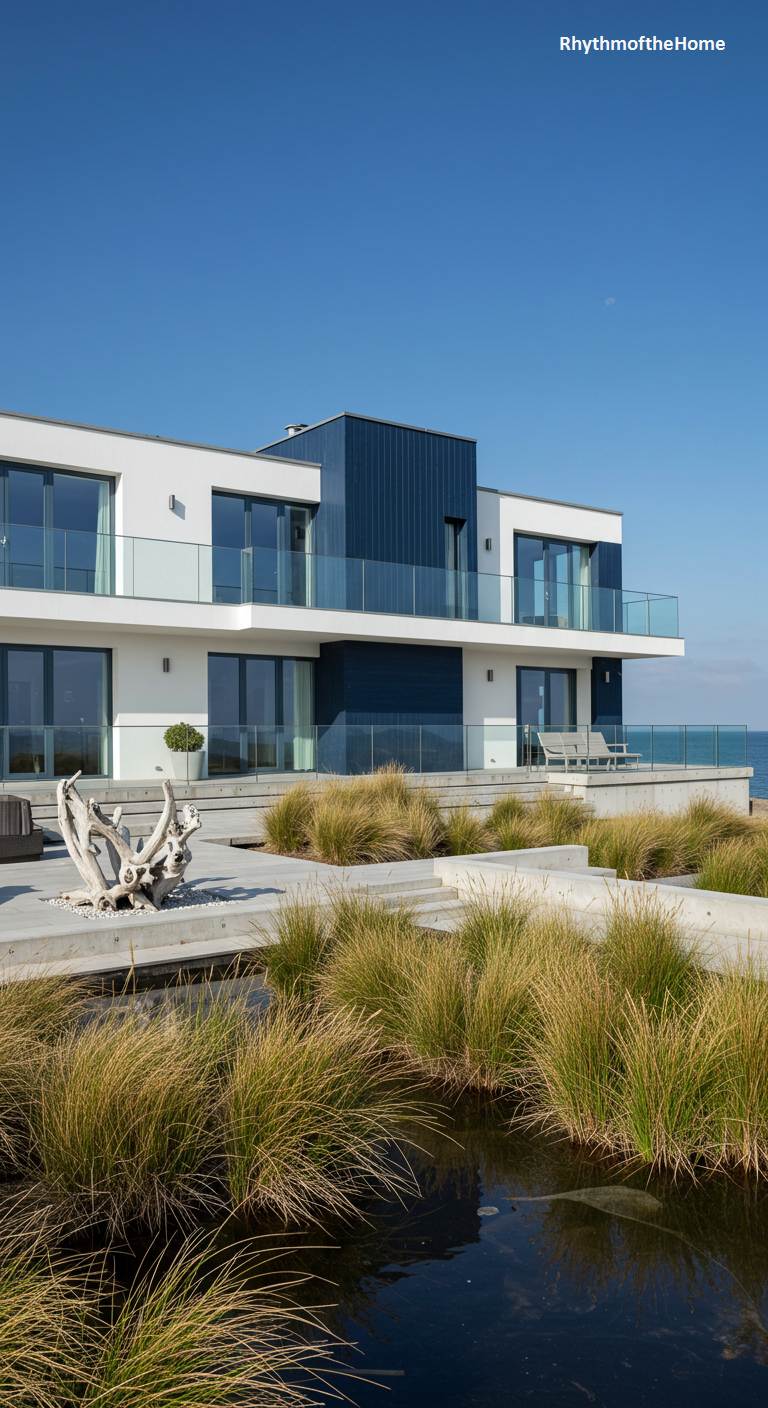 Perched against a brilliant blue sky and the distant sea, this modern home is a study in crisp, geometric forms. Stark white walls contrast sharply with a central volume clad in deep navy blue, creating a bold, nautical statement. Expansive glass walls and balconies with transparent railings dissolve the boundaries between the sleek interior and the vast coastal panorama. The landscaping is minimalist and wild, with windswept grasses and a dark, reflective pond mirroring the sky. This is not just a house, but a viewing platform designed for a life lived in constant conversation with the ocean.
