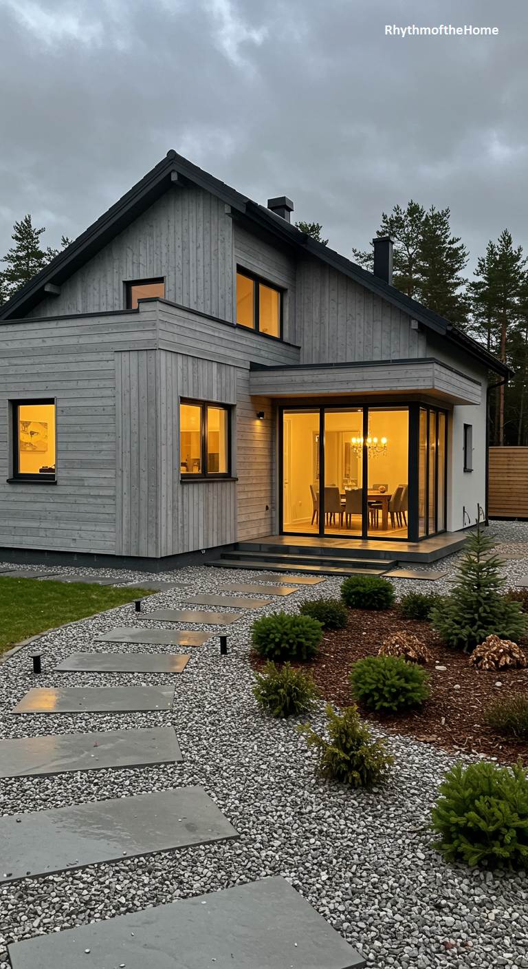 Tucked amongst tall pines, this modern home exudes a quiet, woodland charm. The facade, clad in weathered grey wood, gives it a rustic, lived-in feel, while the sharp lines and dark trim maintain a contemporary edge. As dusk settles, warm light spills from the windows, particularly from a glass-walled dining room that extends into the garden, promising cozy gatherings within. A pathway of simple stone slabs set in gravel meanders through a landscape of humble shrubs, leading to a haven of Scandinavian-inspired tranquility. It’s a perfect fusion of modern design and the comforting embrace of the forest.
