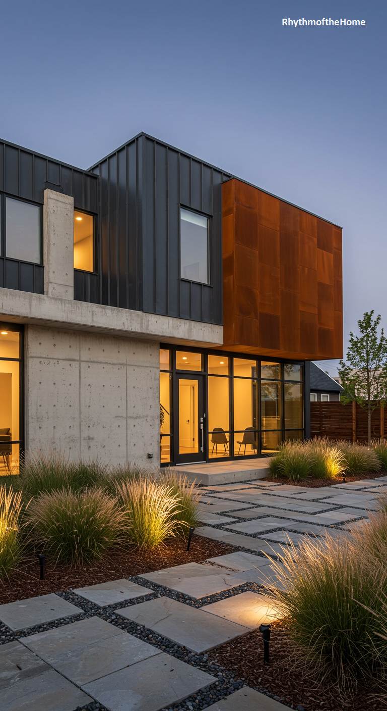 This modern home makes a powerful statement through its bold interplay of raw materials. A base of board-formed concrete provides a solid, textural anchor, its cool grey tones contrasting dramatically with the rich, rust-colored patina of a cantilevered Corten steel volume. Above, dark standing-seam metal siding adds a sleek, industrial finish. As evening descends, warm interior light glows through large windows, softening the structure’s austere geometry. The landscape, with its precise grid of pavers and illuminated ornamental grasses, echoes the home’s blend of rigid form and organic softness, creating a truly dynamic urban residence.