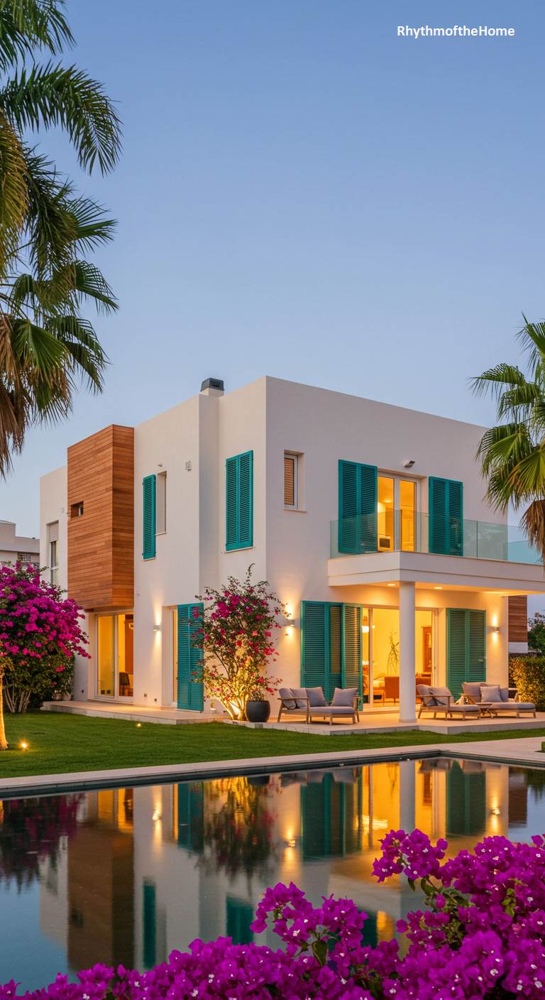 This stunning modern home reimagines Mediterranean style with a burst of contemporary energy. The brilliant white walls serve as a pristine canvas for striking turquoise shutters and a warm, natural wood accent panel. As twilight deepens, the home’s lights cast a golden shimmer across the surface of the tranquil swimming pool. Lush palm trees and cascades of vivid pink bougainvillea frame the scene, infusing it with a tropical, resort-like atmosphere. The seamless flow between the illuminated interiors and the expansive patio creates an idyllic setting for relaxed, elegant living, where every evening feels like a luxurious escape.