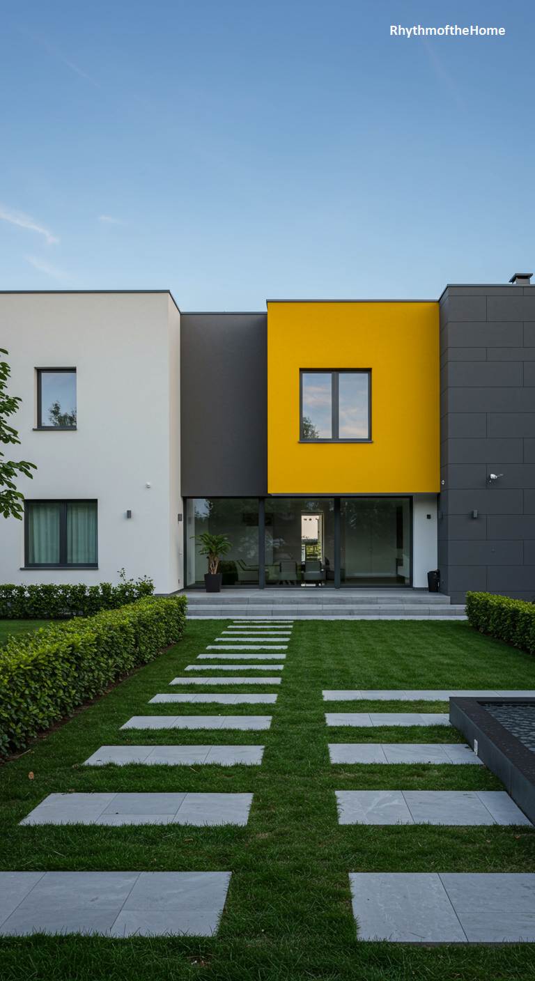This modern home presents itself as a playful yet disciplined study in color blocking and form. Its façade is a confident composition of crisp white, deep charcoal, and a central, sunny yellow block that immediately energizes the design. The strict geometry of the building is beautifully echoed in the meticulously planned landscape, where a path of alternating grey pavers cuts through a perfect emerald lawn, creating a rhythmic journey to the expansive glass entryway. The overall effect is one of vibrant, livable art, demonstrating how a single, bold color choice can infuse a structure with a distinct and joyful personality.