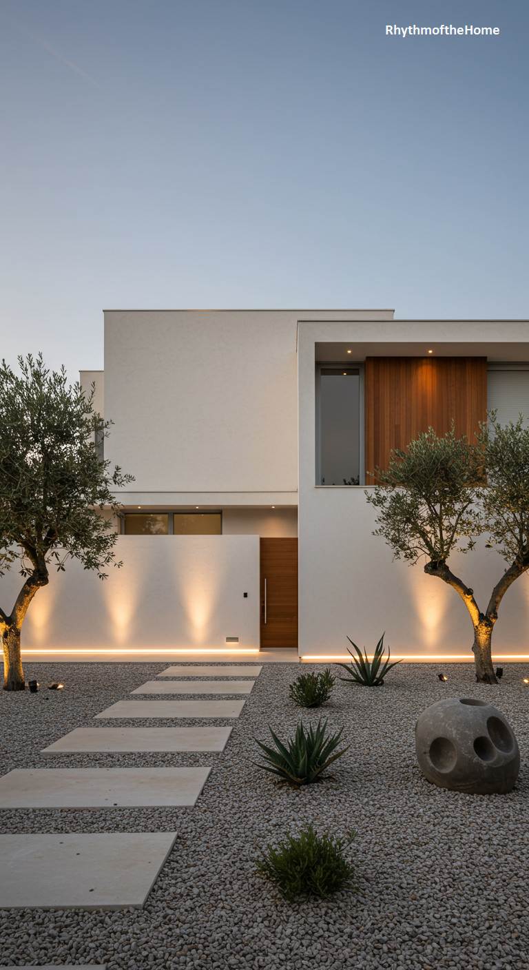 Bathed in the soft glow of twilight, this minimalist modern home exudes a profound sense of tranquility and sophistication. The architecture favors clean lines and unadorned off-white surfaces, which serve as a canvas for a masterful lighting scheme that warmly grazes the walls and uplights the gnarled trunks of mature olive trees. A bed of pale gravel replaces a traditional lawn, providing a textural, Zen-like foundation for hardy agave plants and a unique, porous stone sculpture. A warm wooden door adds an organic touch, creating an entrance that feels less like a doorway and more like a gateway to a private, serene sanctuary.